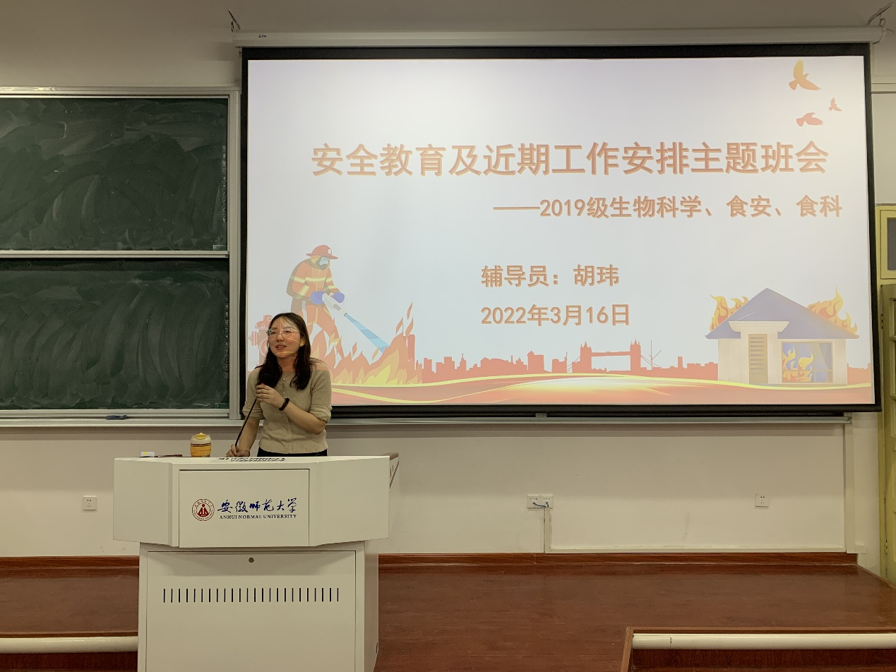 本网讯(生科院 黄琳怡)安全始于心,平安重在行。春季是安全问题多发期,为进一步保障学生安全,加强学生安全防范意识,3月16日召开安全教育及近期工作安排主题班会。2019级生物科学(师范)、食品质量与安全及食品科学与工程专业全体学生参加本次会议,会议由辅导员胡玮主持。