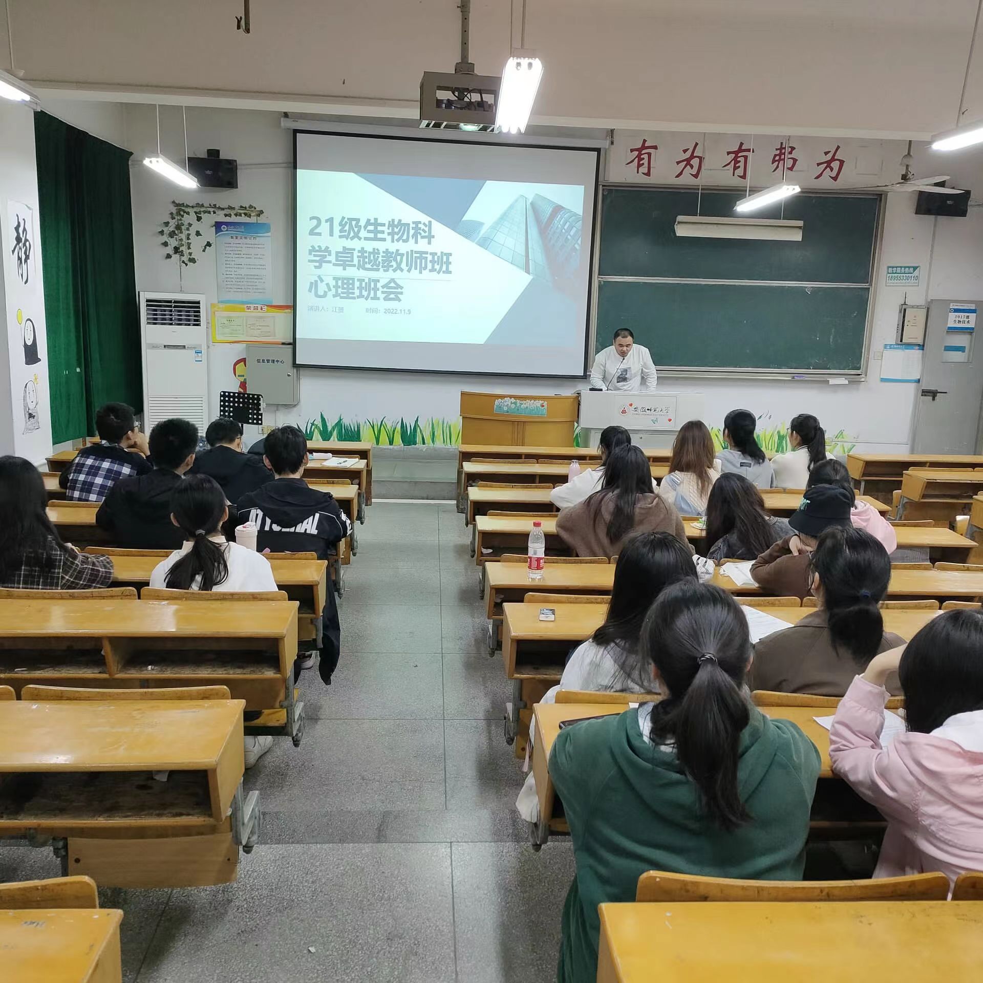 2022年11月9日晚,21级生科卓越教师班于田楼8308教室开展“拥抱快乐,拒绝焦虑”主题心理班会。本次班会围绕情绪何为低落,如何消除减轻心情低落的不利影响和如何拥抱快乐三个方面展开。班会由心理委员江赟主持,卓越班全体学生参加,同学们反响热烈,氛围融洽。