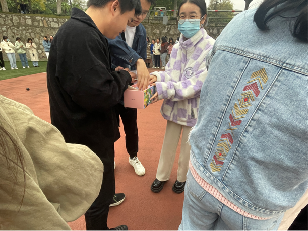 活动由三个环节组成。第一环节为“笔映成趣,心迹霏霏”。心理委员里将同学们写的匿名便利贴放到小盒子里,随机抽取,分享阅读,收获快乐。第二环节为“萌宠落谁家”。随着歌声传递玩偶,歌声停时玩偶花落谁手,便进行才艺表演。第三环节为“蒙眼出击”。各组选出方向感较好的同学,进行蒙眼对抗。三轮游戏充分展示了同学们的心声、才艺、团队协作能力。整个操场回荡着同学们的欢声笑语。