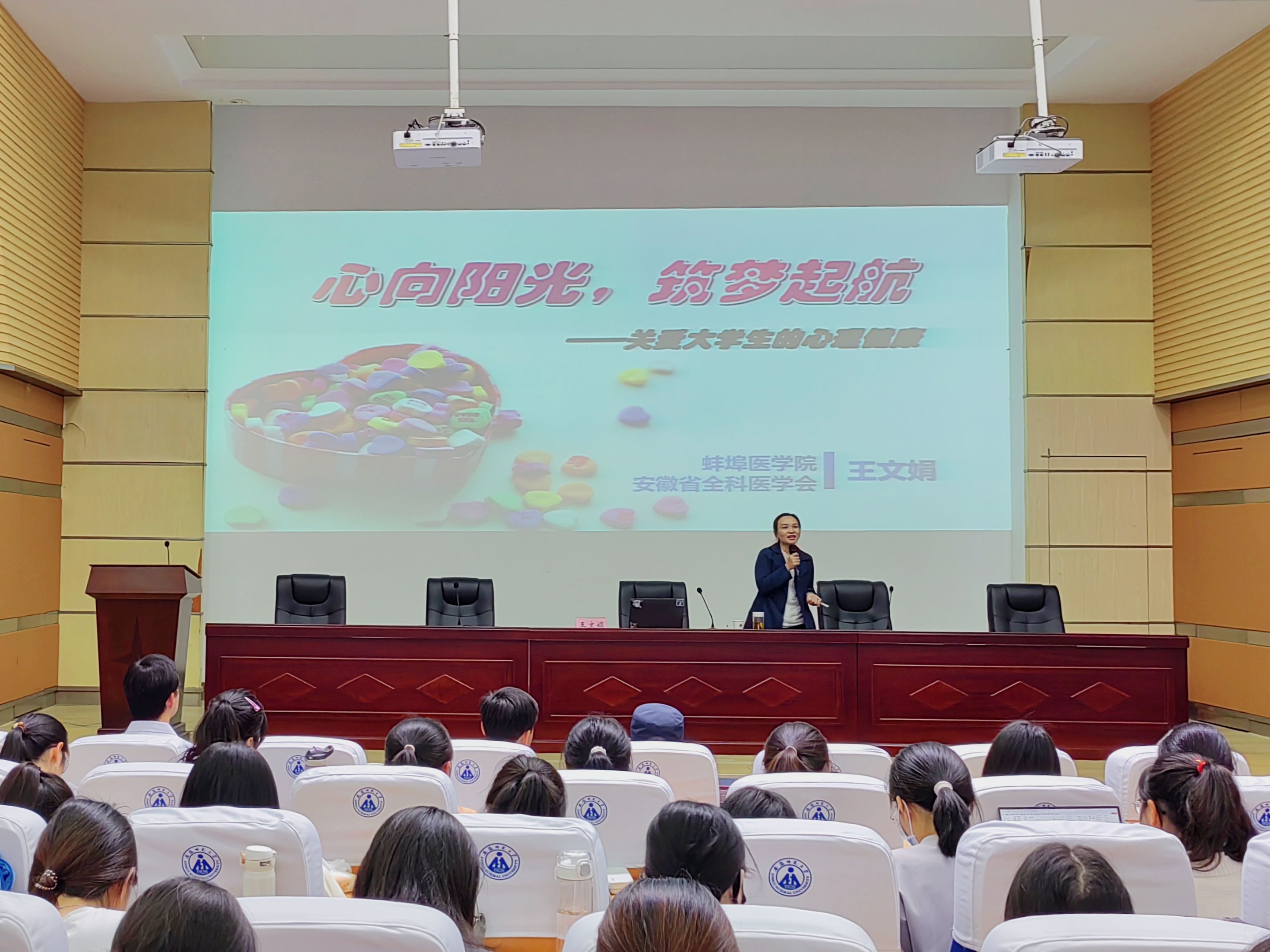 辅导站站长周文娟开篇介绍此次讲座的目的是呼吁大家要认识生命、热爱生命,以积极乐观、理性平和的态度面对人生。首位主讲嘉宾是来自蚌埠医学院精神卫生学院临床心理学教研室主任、安徽省青少年研究会理事王文娟副教授,王文娟以 “心向阳光,筑梦启航”为题,向同学们分别介绍了大学生心理健康现状、常见的心理问题以及如何维护自身的心理健康。第二位主讲嘉宾是来自皖南医学院第一附属医院——弋矶山医院急诊内科主任吴敬医教授。吴敬医教授,以心肺复苏、鱼刺卡喉处理、割伤处理为例向同学们进行了急救知识培训。二位专家在讲座过程积极与学生互动,讲座氛围热烈,轻松。