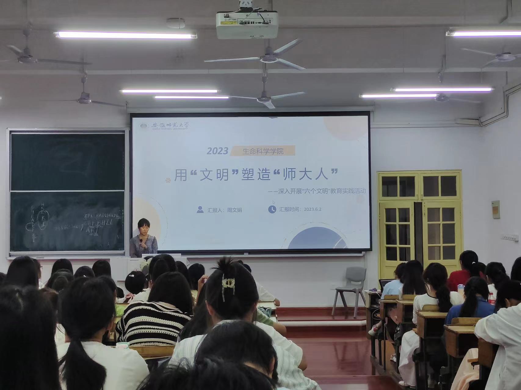 为全面提高学生文明素养,弘扬文明风尚,共建文明校园。6月2日晚, 2021级生物科学专业全体学生于田楼1401教室开展了用“文明”塑造“师大人”——深入开展“六个文明”教育实践活动主题班会。会议由辅导员周文娟主持召开。