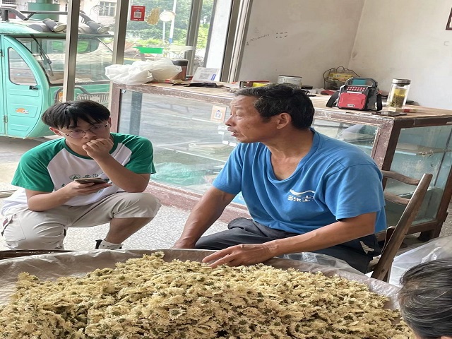 对于菊花未来的发展问题,指导老师杭华就黄山富硒贡菊烘干工艺优化及烘干机器改进等方面与基地负责人洪志斌进行讨论,并对黄山富硒贡菊的市场销售状况进行了解,讨论富硒贡菊农副产品的开发,以扩大贡菊市场。在外务工的老乡也尽心尽力为家乡宣传,为故土菊花销售铺路架桥。虽人在外乡,但仍心系家乡。菊花产业让那些游子看到了家乡的未来,能有效改善“青年缺席”的现象,蕴含着勃勃生机。而这离不开党的帮扶和人民的努力。在政策支持和人才支持下,当地不仅安装了菊花专用烘干车间大大缩短生产时间,还采用富硒贡菊脱毒工艺,很大程度上抵御了病菌的感染。洪经理也是抓住机会,积极与专业机构展开交流合作,完善产业链。做到最大程度的保留菊花新鲜程度和饮用价值,极力打造当地特色农业。