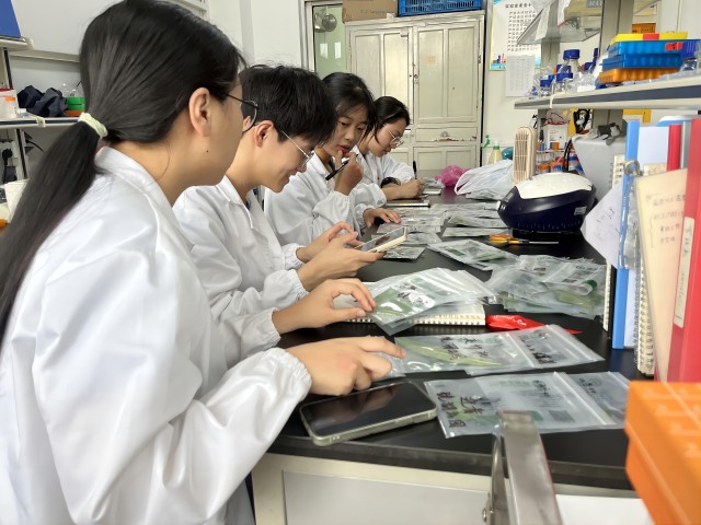 上午8点30分,团队成员来到实验室进行实验的第一步,即对昨日采回的植物叶片样本进行分类。团队根据各人所长对分类工作进行了合理分工,由两名擅长分类的成员进行植物的辨认,确定样品叶片所属植物分类地位的科和种,由一名成员给已分类的样品写上标签,并将同科植物的叶片样品集中放置,方便整理,由一名写字快的成员对每个样品进行记录和编号。面对百余个样品,成员们有条不紊、各司其职,较为迅速地完成了样品分类工作,为下一步实验的进行做好准备。