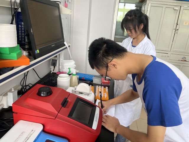 “你们看,移液枪的正确握法是这样的......”团队成员在相关人员的指导下学习使用各种仪器,随即展开对叶片DNA的提取工作。“你们既然留下来了,那我希望你们把这个暑期实践做好。”辅导员对参加实践活动的成员们说道,而团队成员也没有辜负辅导员的期望。称量、研磨、离心、滴加各种试剂,所进行的每一步操作,团队成员都十分认真,不敢有一丝马虎。经过两天的实验,至7月9号,DNA的提取工作已全部完成。
