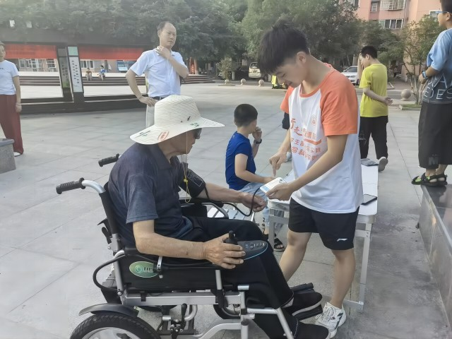 首个志愿服务工作为量血压。四腿桌、血压器、旧板凳满足全部器材需要。队长周立在测量过程中时时安抚,活动氛围轻松愉快,在考虑到居民的身体健康的同时,更在轻松交谈中给大家送去关怀。此外,露天观影活动也依次进行,居民们整齐排坐,扇风闲谈,场面温馨。为照顾到低年龄段群体,团队组织了篮球比赛等多项趣味活动,至傍晚本次志愿服务已顺利完成。