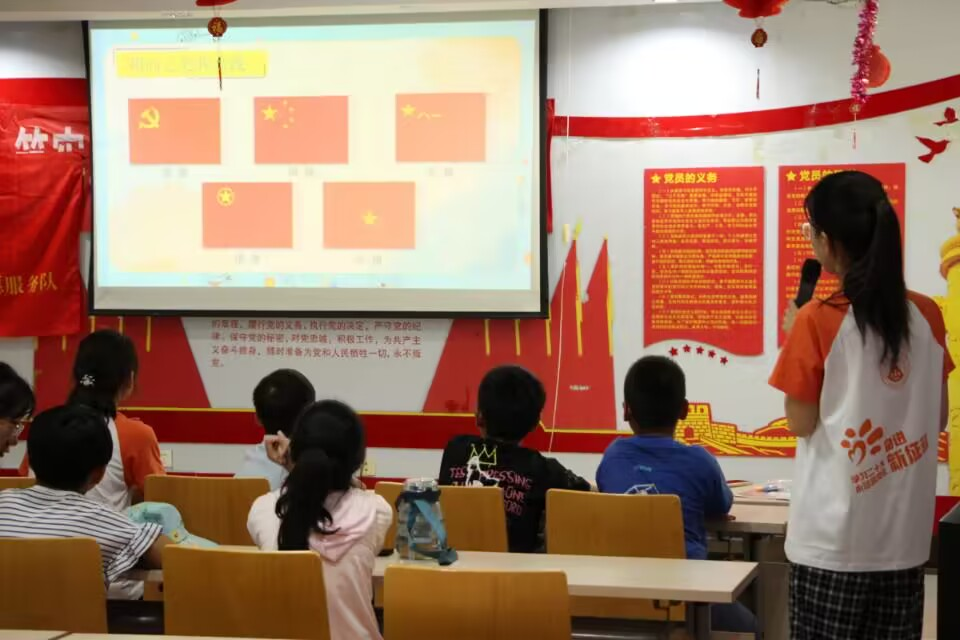 本次“红色之旅”是从识别国旗、党旗、军旗、团旗和队旗开始。志愿者张璐璐通过课件展示、随堂测试和动手制作这三种形式来推动课程进行。课件上展示了五种旗帜的照片以及在升旗时的注意事项,小朋友们看得津津有味,纷纷表示到:“原来有那么多旗帜啊,不仅仅有国旗这一种......”在本次科普环节的最后,张璐璐拿出来制作国旗装置的道具,她分发给小朋友们并耐心进行手工教学,小朋友们看着面前安装好的升国旗装置都笑得十分开心,在使用装置升国旗时表情十分严肃仿佛站在操场上目视升国旗行注目礼一般。
