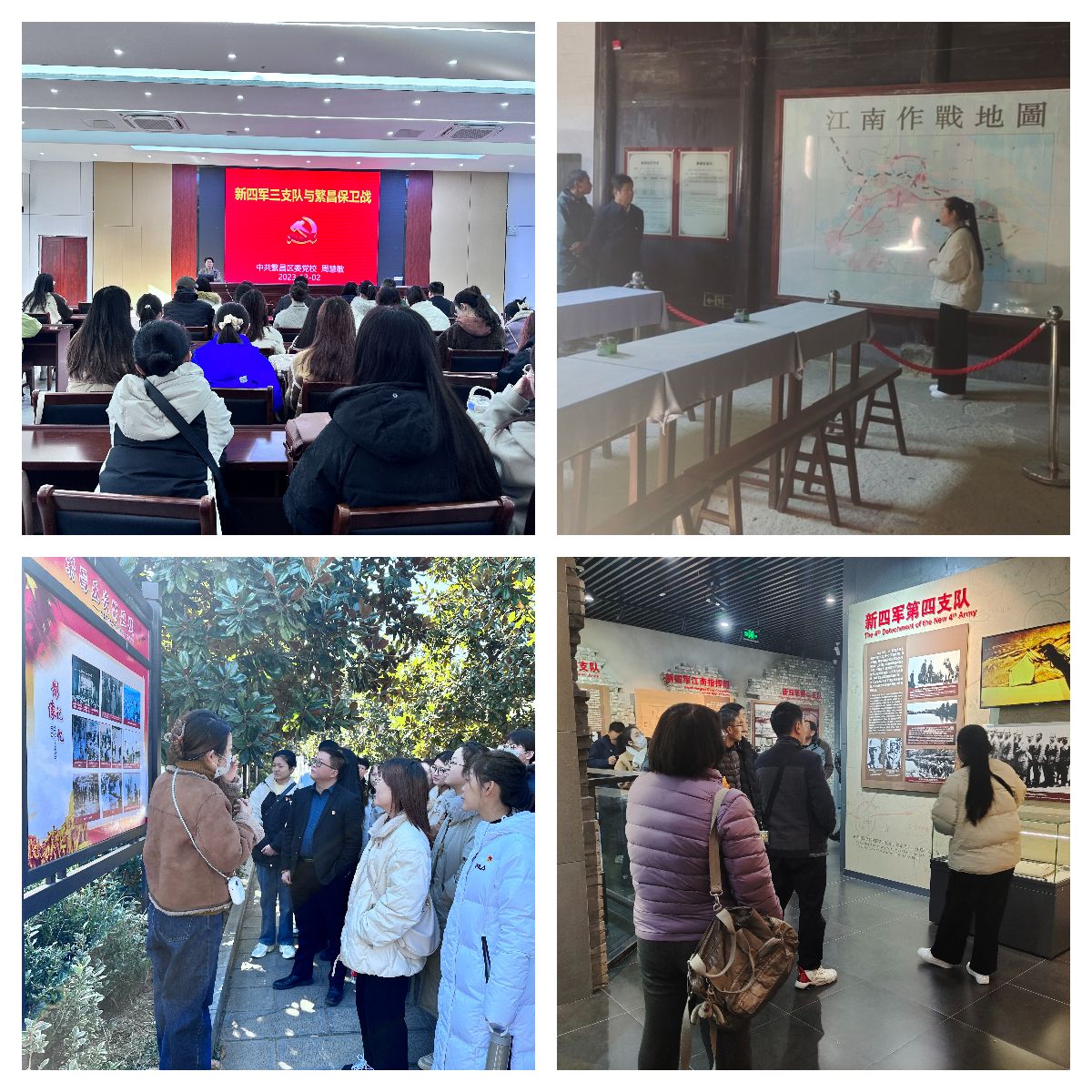 在繁昌县孙村镇中分村红色学堂,繁昌区委党校副校长周慧敏为党员师生作《新四军三支队与繁昌保卫战》的专题党课,讲授了新四军三支队的历史,以及在繁昌保卫战奋勇抗击日本侵略者,最终取得伟大的胜利的光辉历史;随后,党员师生们跟随红色讲解员参观新四军第三支队司令部旧址纪念馆,瞻仰谭震林同志在半个多世纪的革命岁月中,为中国人民革命武装力量的发展和壮大、为中国人民革命事业的胜利作出的卓越贡献。最后,党员师生们参观了全国最大的成套毛主席像章收藏馆——马仁奇峰红色收藏馆。