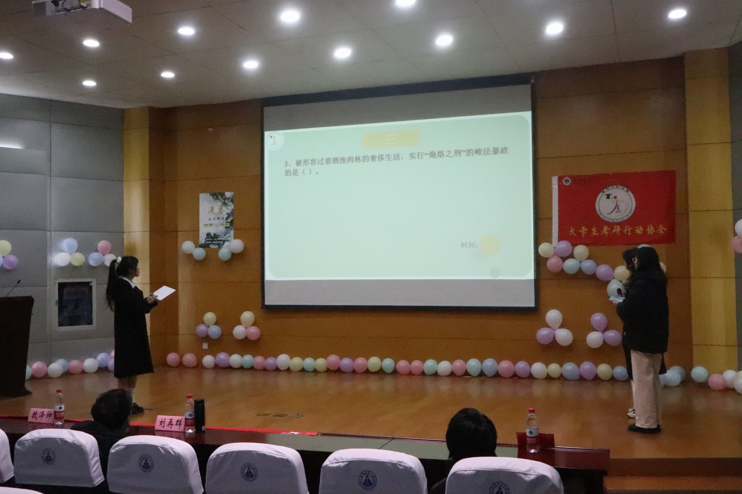 为了营造良好的学习氛围,拓展大学生综合素质,2023年12月20日下午,大学生考研行动协会“一站到底”学霸综合知识挑战赛总决赛在田楼报告厅如期举行。76net必赢线路检测中心党委副书记汪倩倩、协会指导老师刘再群和魏泽坤应邀参加本次活动。