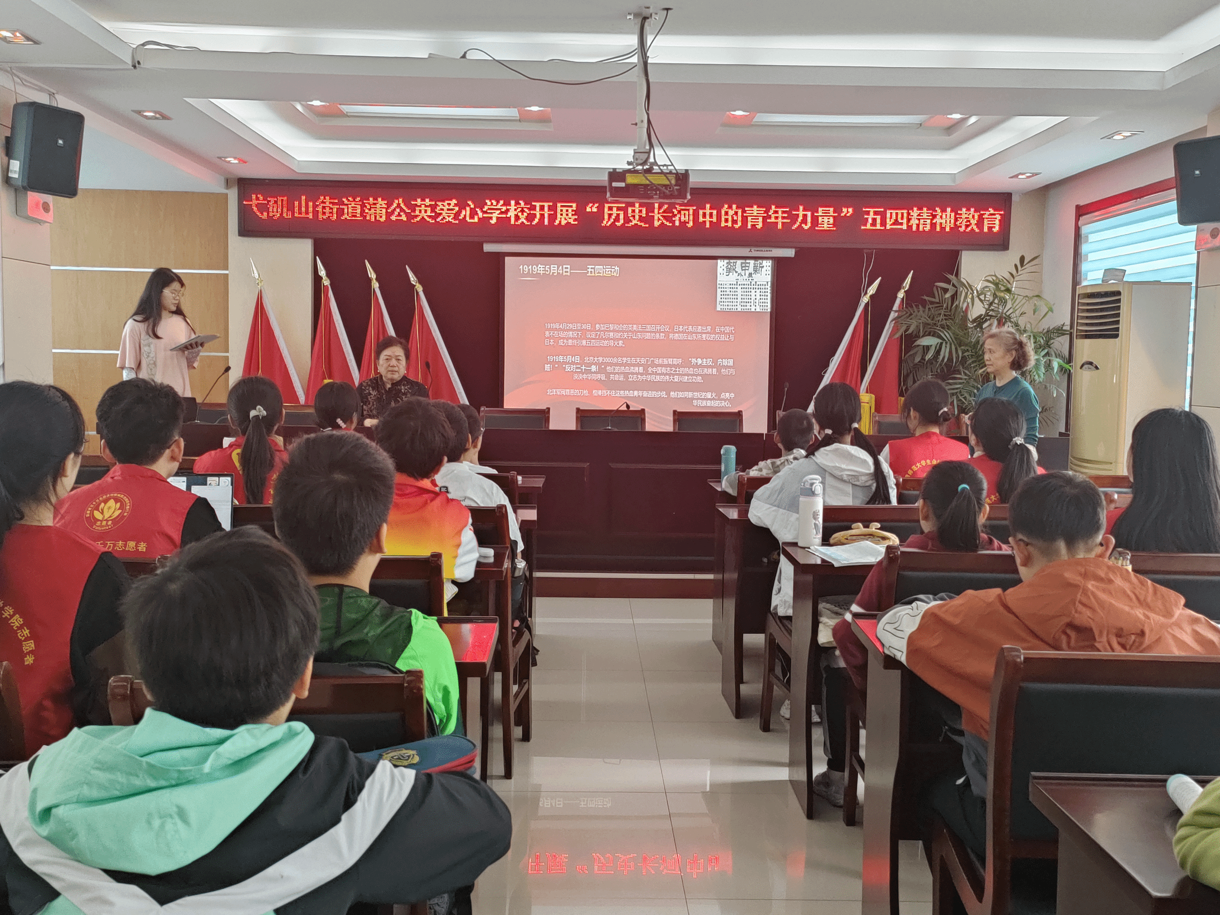 4月27日,76net必赢线路检测中心团委志愿者服务部联合镜湖区弋矶山街道团工委关工委于街道蒲公英爱心学校开展“历史长河中的青年力量”五四精神主题教育活动,青年们重温五四历程,缅怀革命先驱。