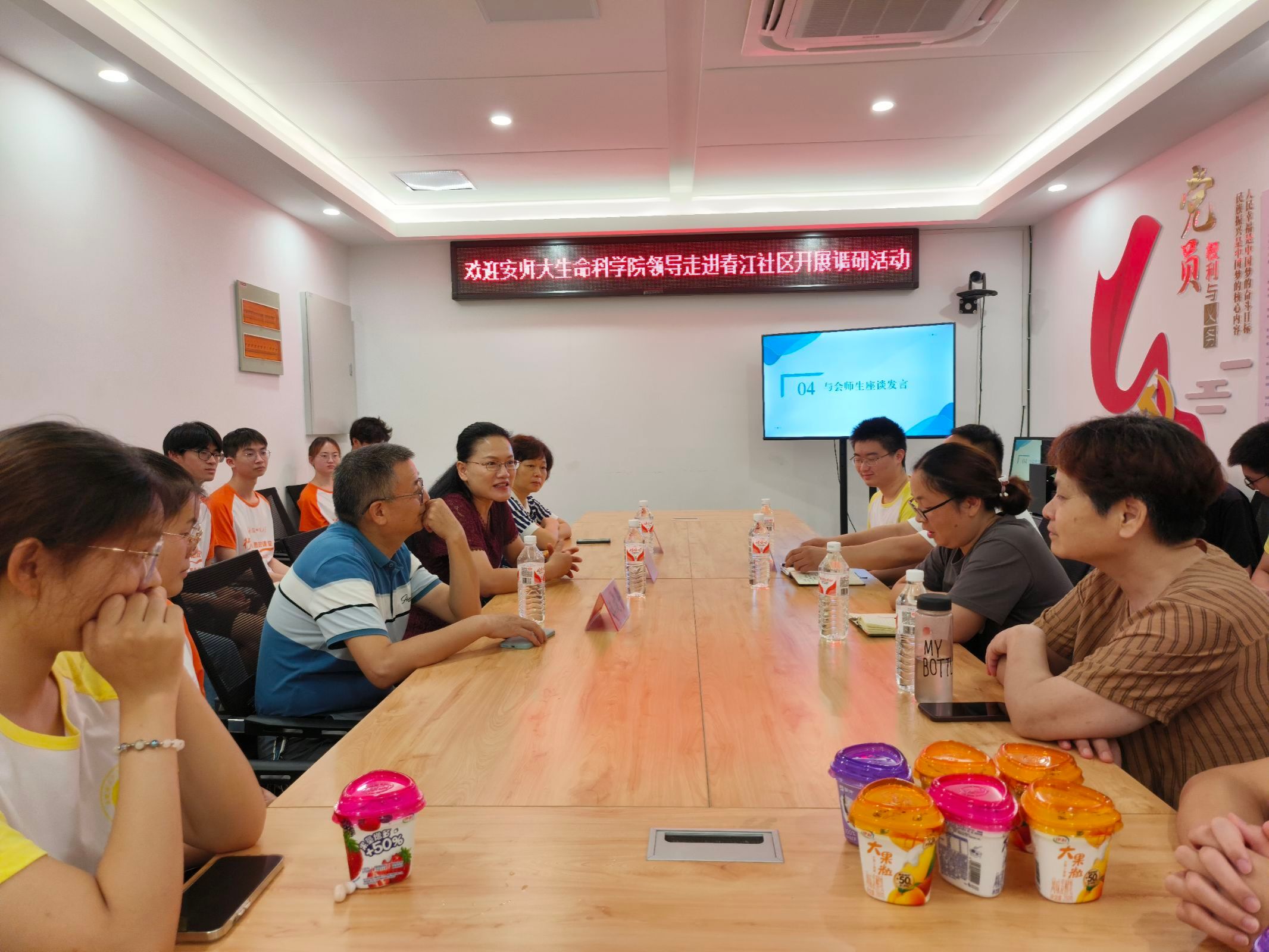 开课典礼圆满落幕之后,院长朱国萍一行以及生科院赴芜湖市防艾遏核宣教实践团队和生科院赴春江社区“矢志扬新风,携手递温情”社会实践团队,齐聚小会议室举办暑期实践慰问会。