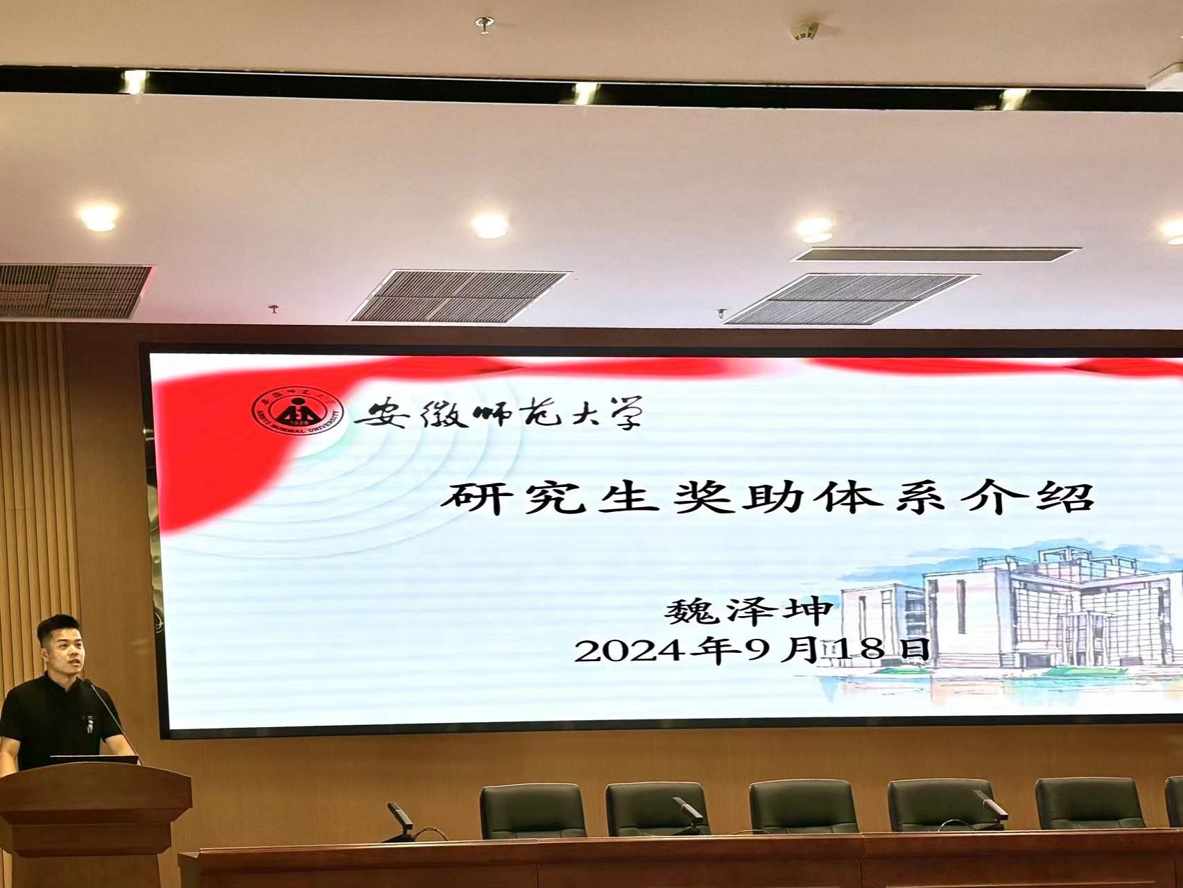 紧接着,魏泽坤从国家助学金、三助一辅、国家奖学金、学业奖学金、先进个人以及生科院研究生科研积分方案等方面向同学们介绍了学校和学院完善的奖助体系,并祝愿每一位同学学业有成,早日找到通往未来的钥匙。