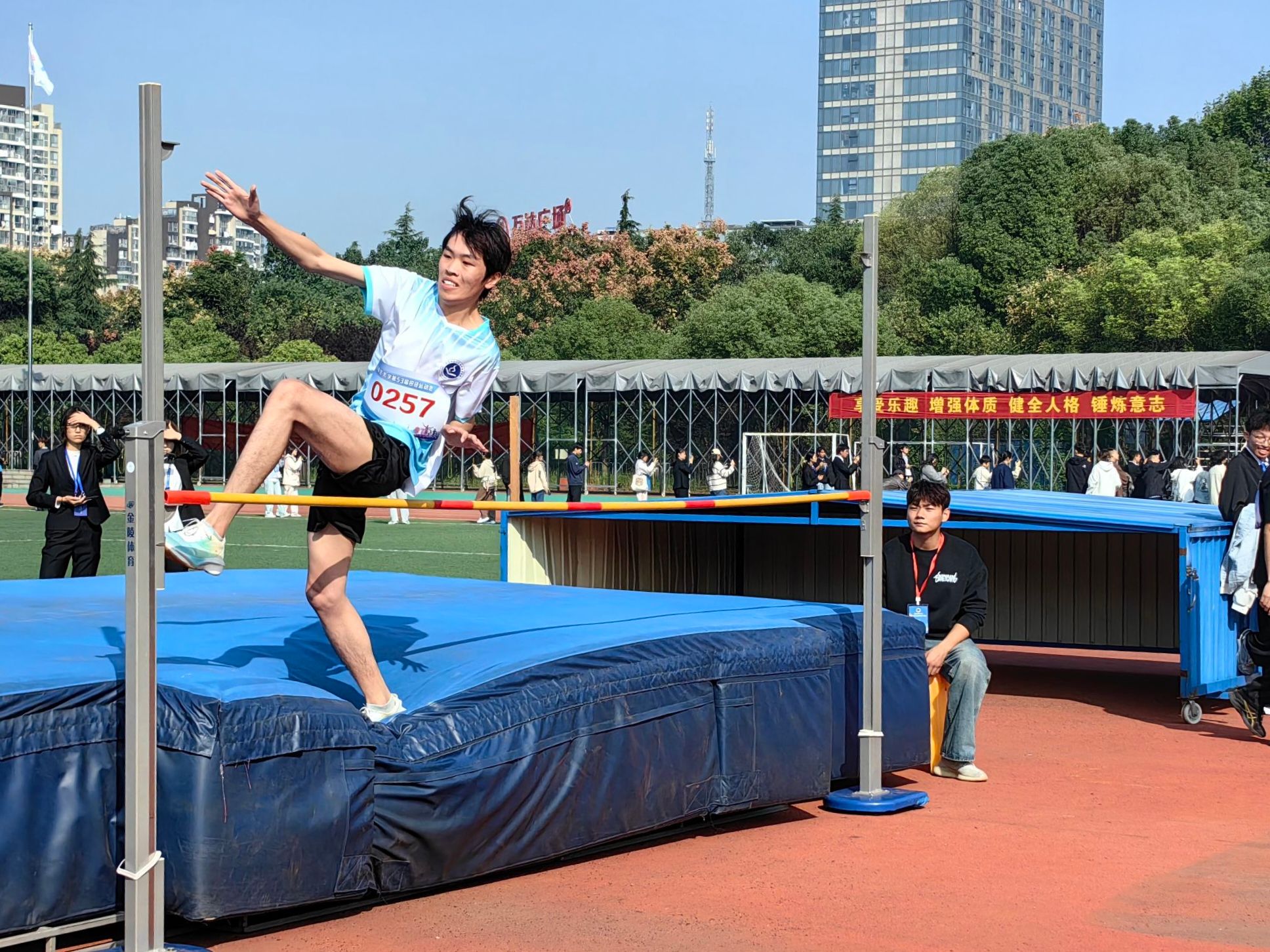 图为跳高选手孔令起的跳高场景