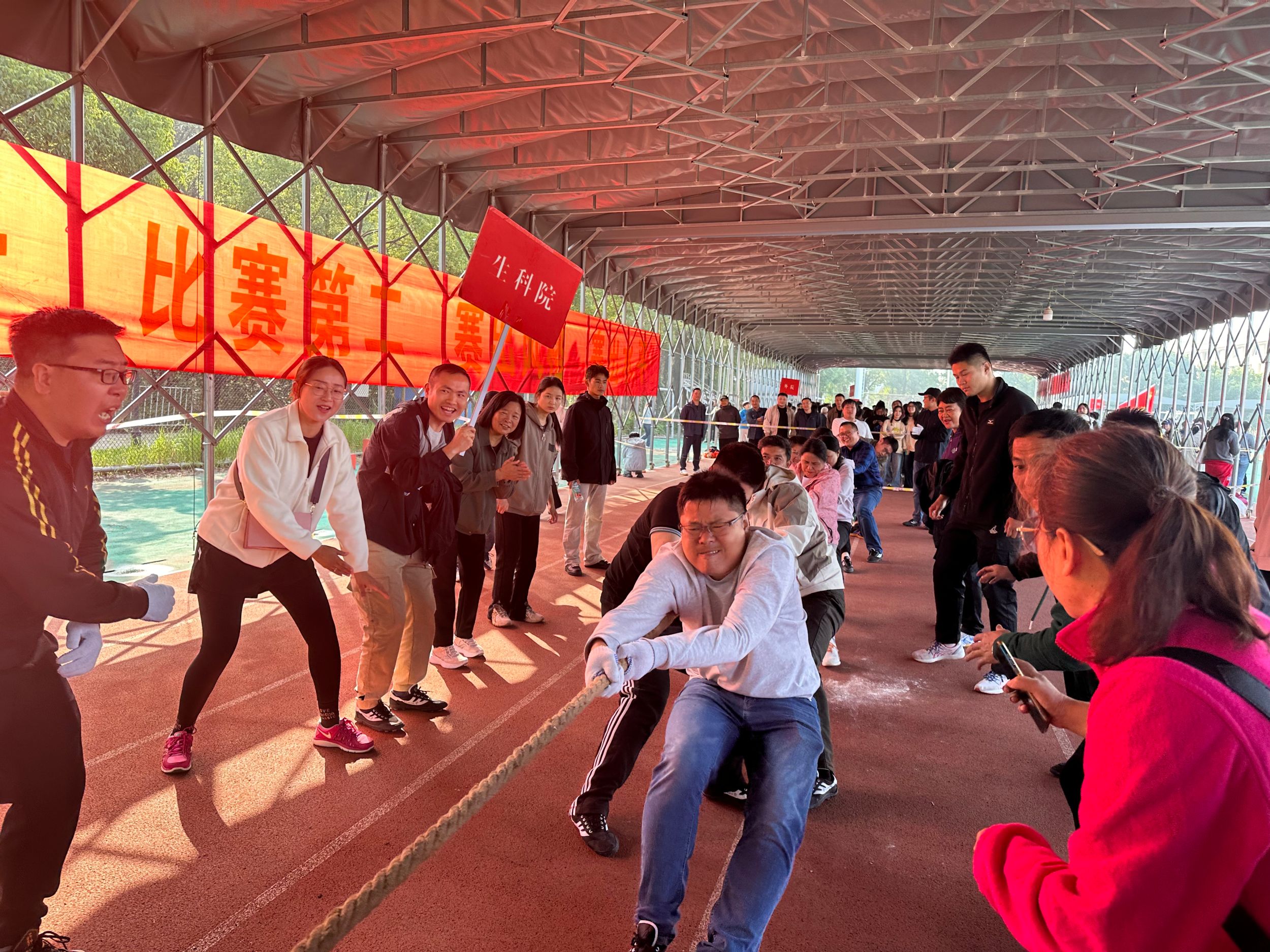 图为教职工拔河比赛场景