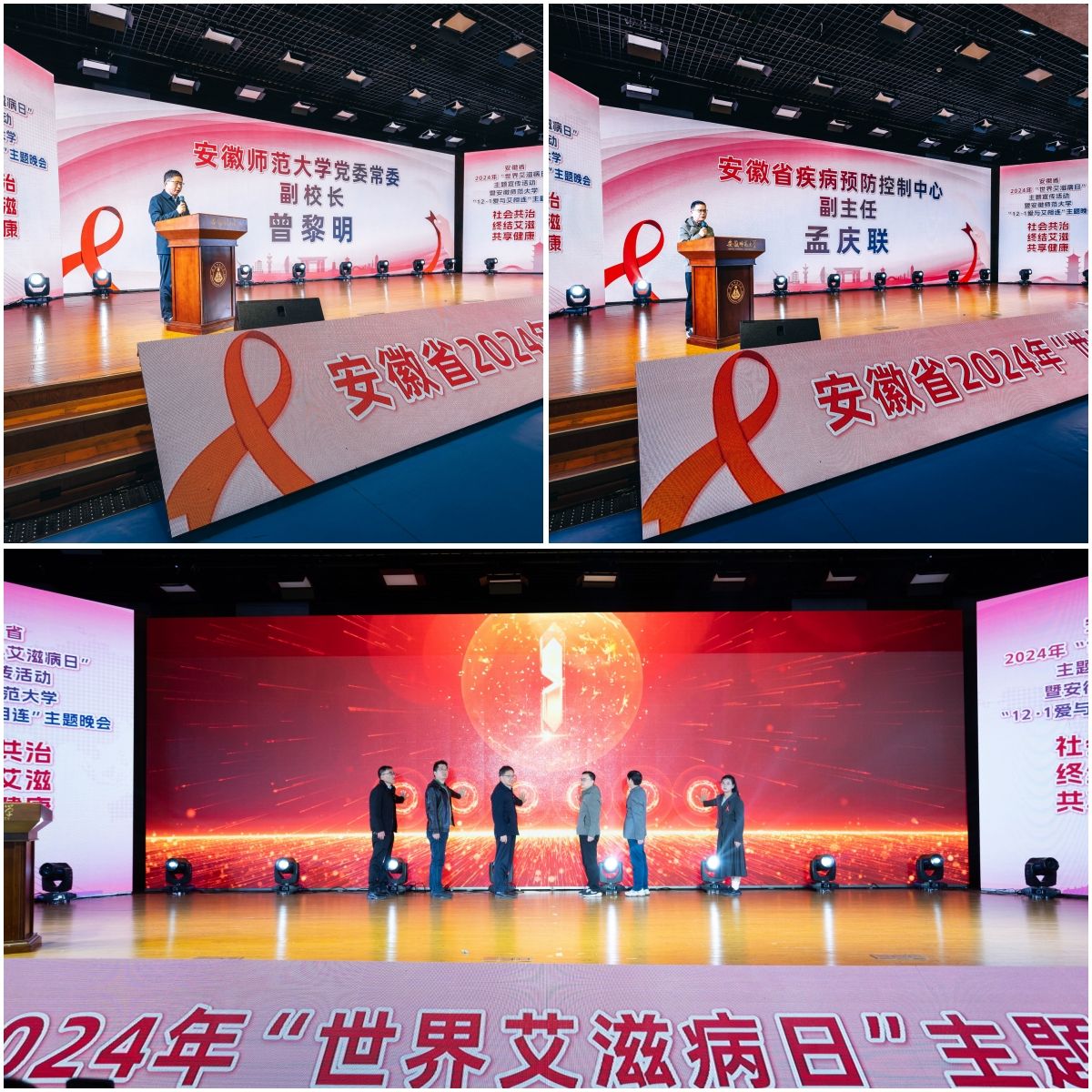 安徽师范大党委常委、副校长曾黎明、安徽省疾控中心副主任孟庆联相继为活动致词,大学生防艾代表发出防艾倡议,与会人员共同见证了安徽省2024年“世界艾滋病日”主题宣传进校园活动启动仪式。