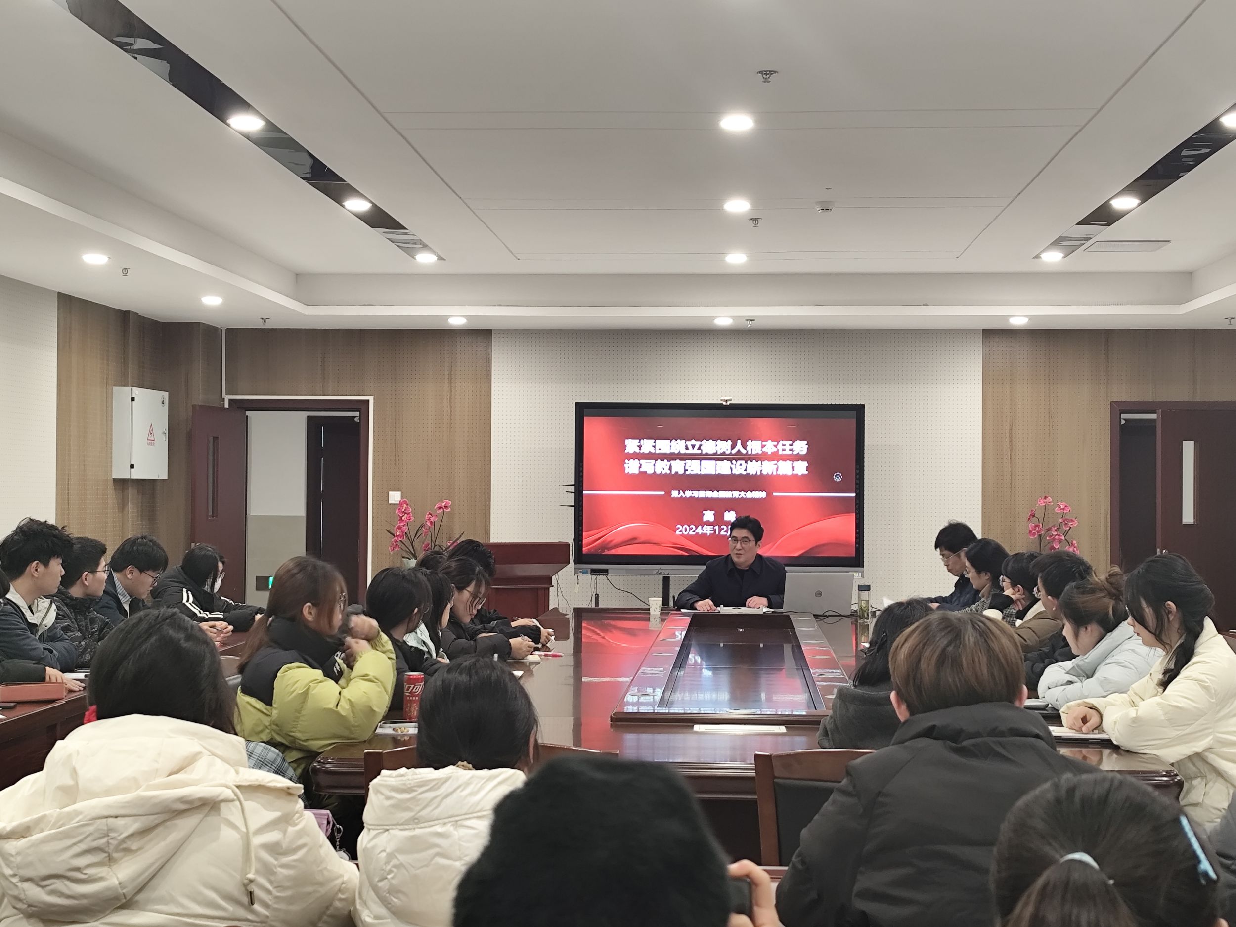 高峰以《紧紧围绕立德树人根本任务,谱写教育强国建设崭新篇章——深入学习贯彻全国教育大会精神》为题,指出全国教育大会擘画了教育强国建设宏伟蓝图,为教育事业高质量发展提供行动指南,他希望同学们传承爱国主义精神,把个人理想抱负和国家需要和时代发展需求相融合;传承科学家精神,早进实验室、早进课题组,早开展大创项目,聚焦新时代需求,提升个人素质能力;希望师范专业学生和与会教师传承教育家精神,做新时代“大先生”,认真学习贯彻《教育强国建设规划纲要(2024-2035年)》,坚持不懈用习近平新时代中国特色社会主义思想铸魂育人,全力推动全国教育大会精神落地见效。
