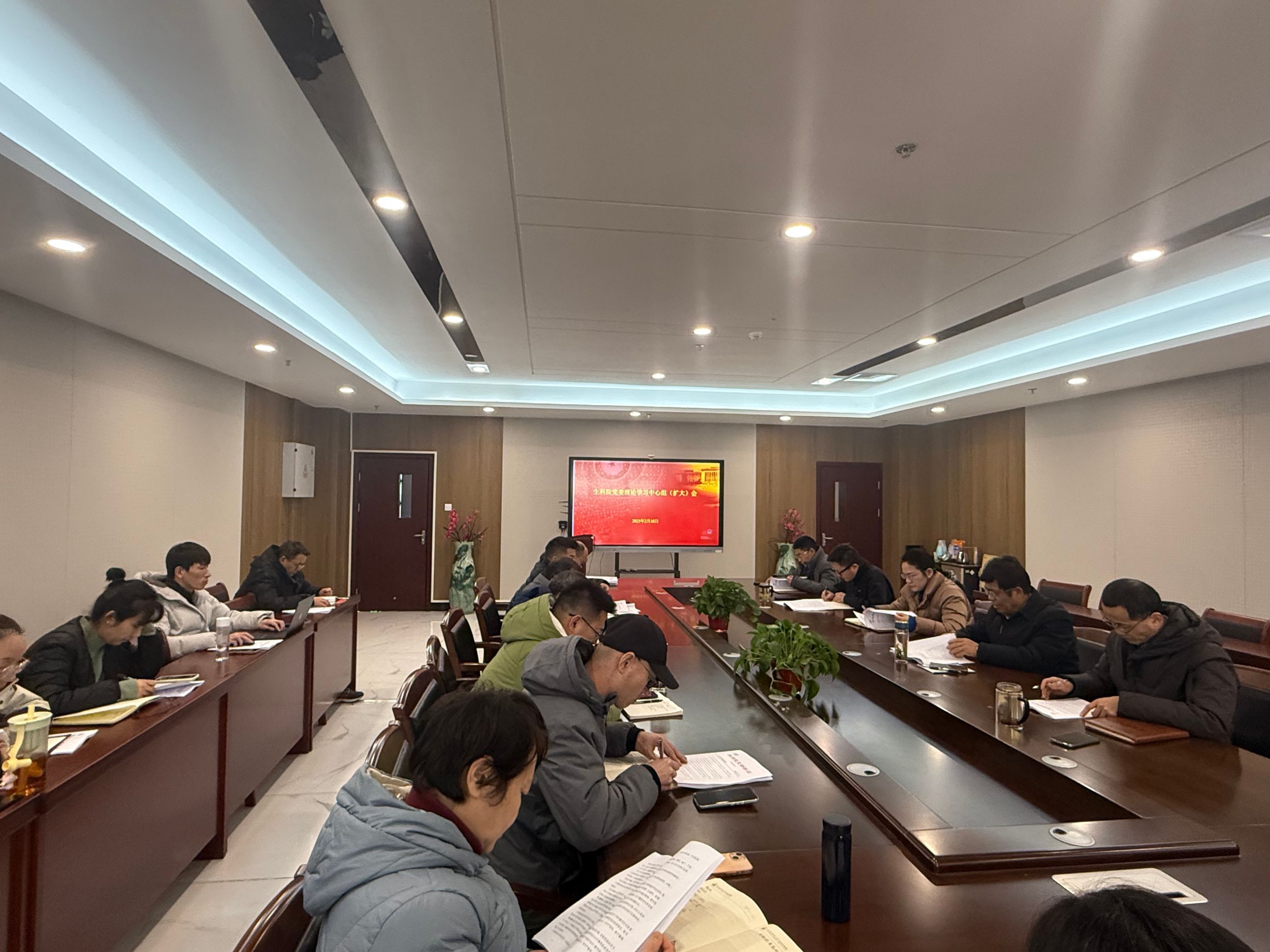 2月18日,生科院党委召开理论学习中心组学习(扩大)会,学院领导班子成员、党委委员、支部书记和全体专兼职辅导员参会。会议由学院党委书记蒋学波主持。
