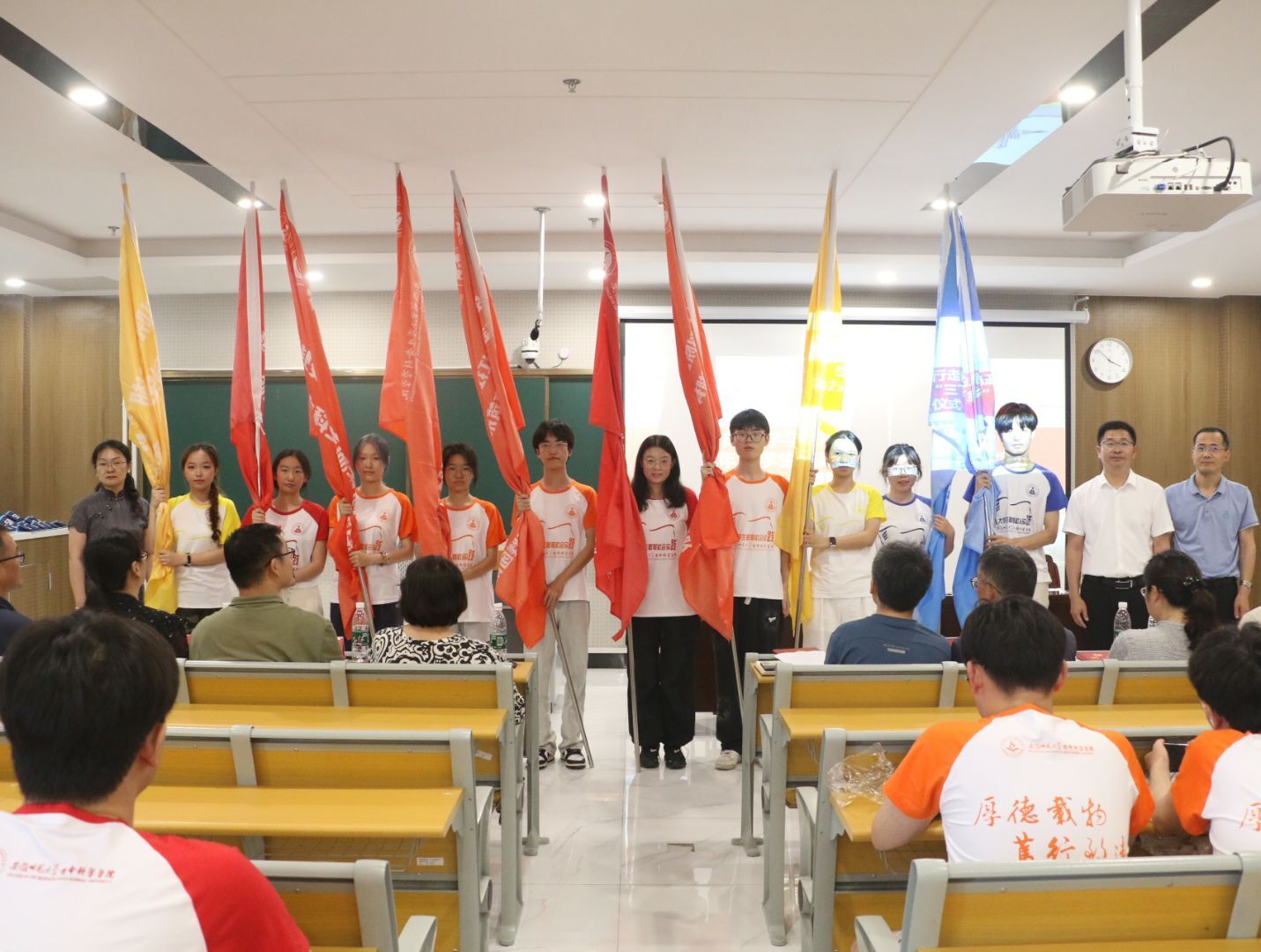 全体实践队员在学生代表许琳婕的带领下庄严宣誓,承诺扎根基层、践行使命。学院领导为各实践团队授旗,2025年暑期“三下乡”社会实践活动正式开始。会后,刘梦婷围绕安全规范、新闻写作、宣传技巧三大主题,为全体实践队员送上“实践锦囊”。