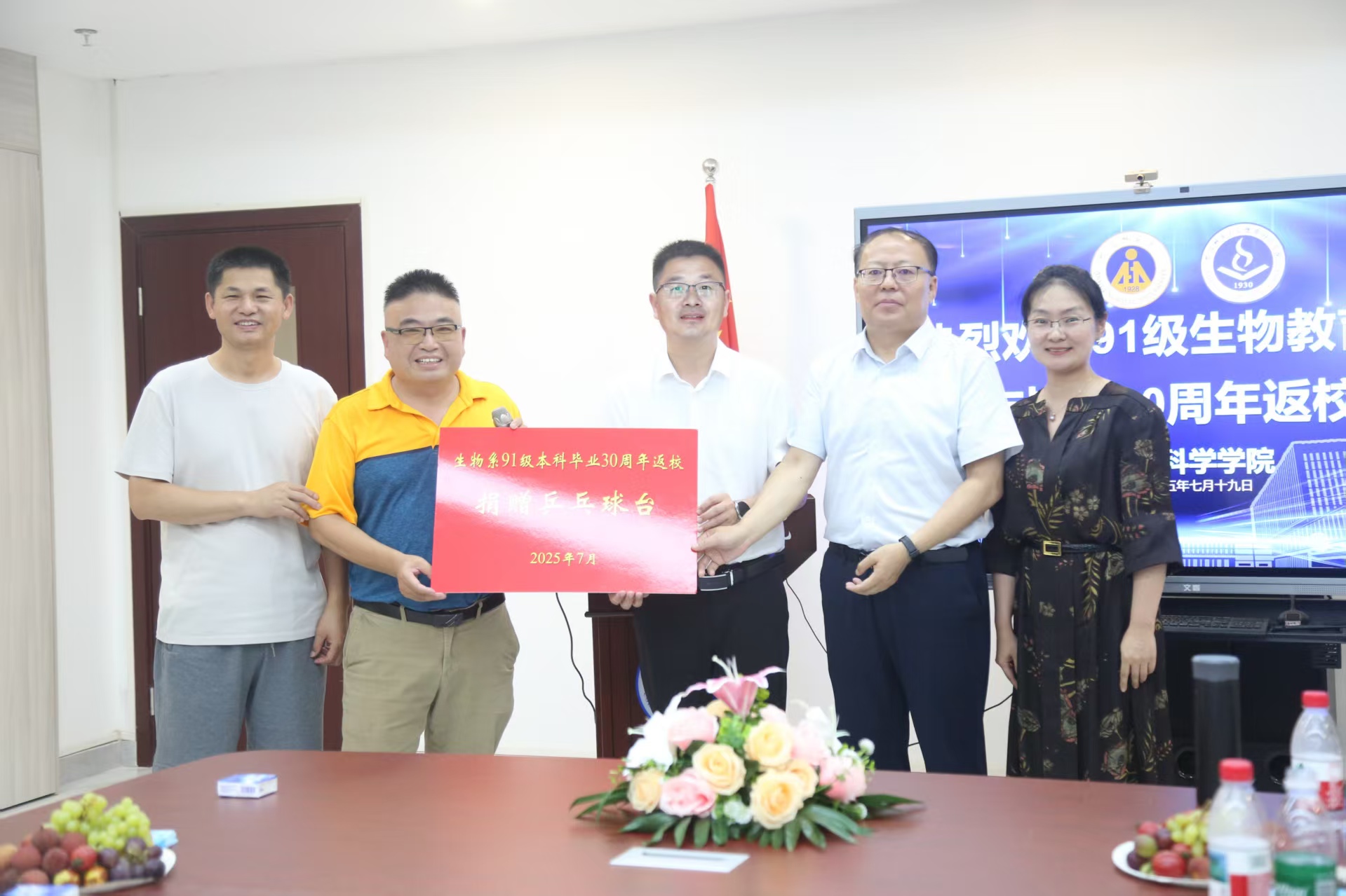 校友代表程裕富、张利海、徐志虎、刘晓颖、胡荣贵、刘小坤、吴金龙、万勤、刘娜娜等分别向老师和母校汇报了各自工作和成长历程,他们表示,自己所取得的每一个成绩都离不开母校的熏陶和老师的教诲,在各自人生奋斗前行的道路上始终铭记母校“厚德、重教、博学、笃行”的校训精神,用实际行动践行着师大学子的责任与担当,并向各位老师送上最关切的问候,向母校送上最真切的祝福。会上校友代表向老师、学院领导赠送纪念品,并向学院捐赠乒乓球台。