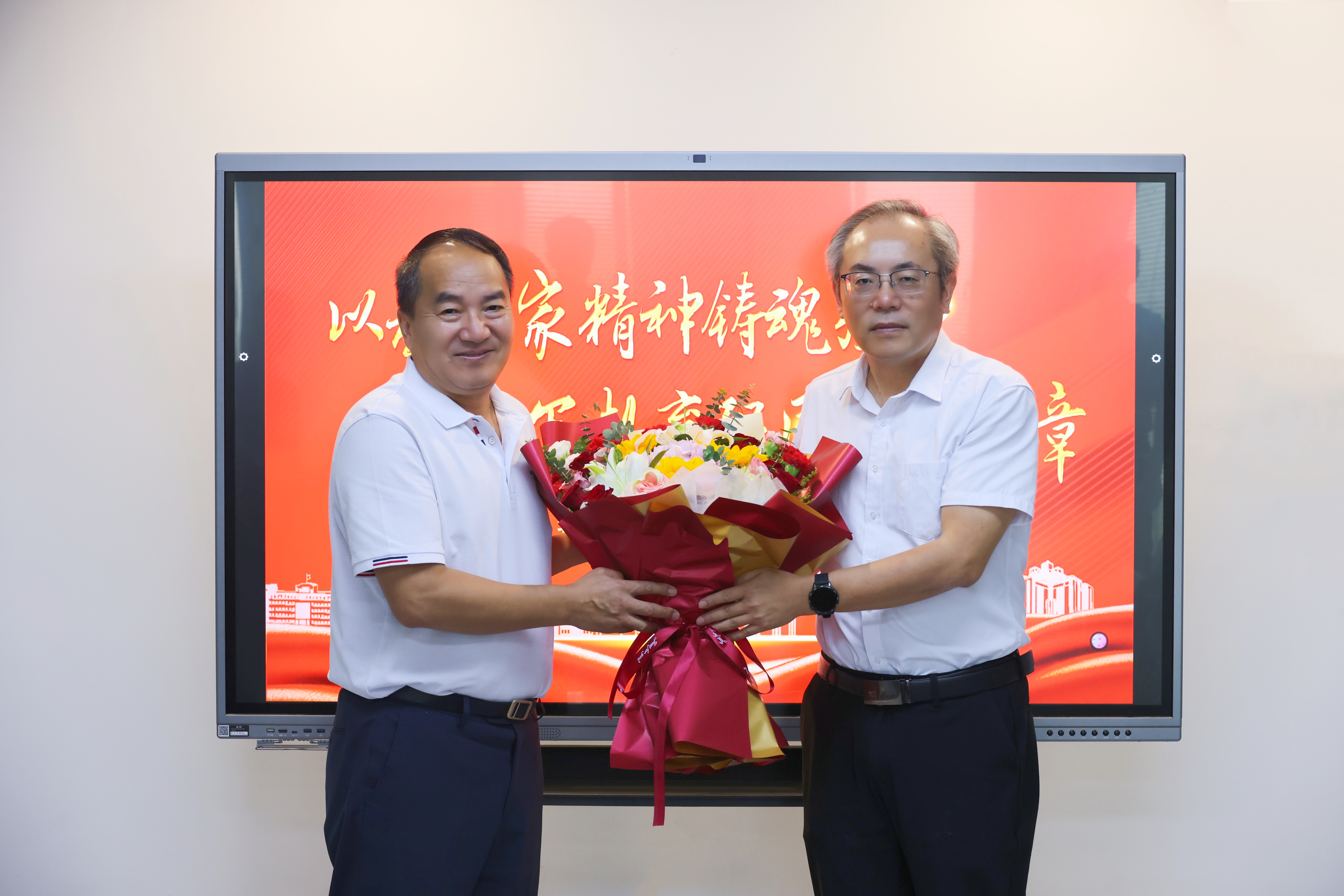 蒋家平向李枢强赠送鲜花,李枢强表示,将牢记“为党育人、为国育才”使命,继续带领团队攀登生物学科新高地。