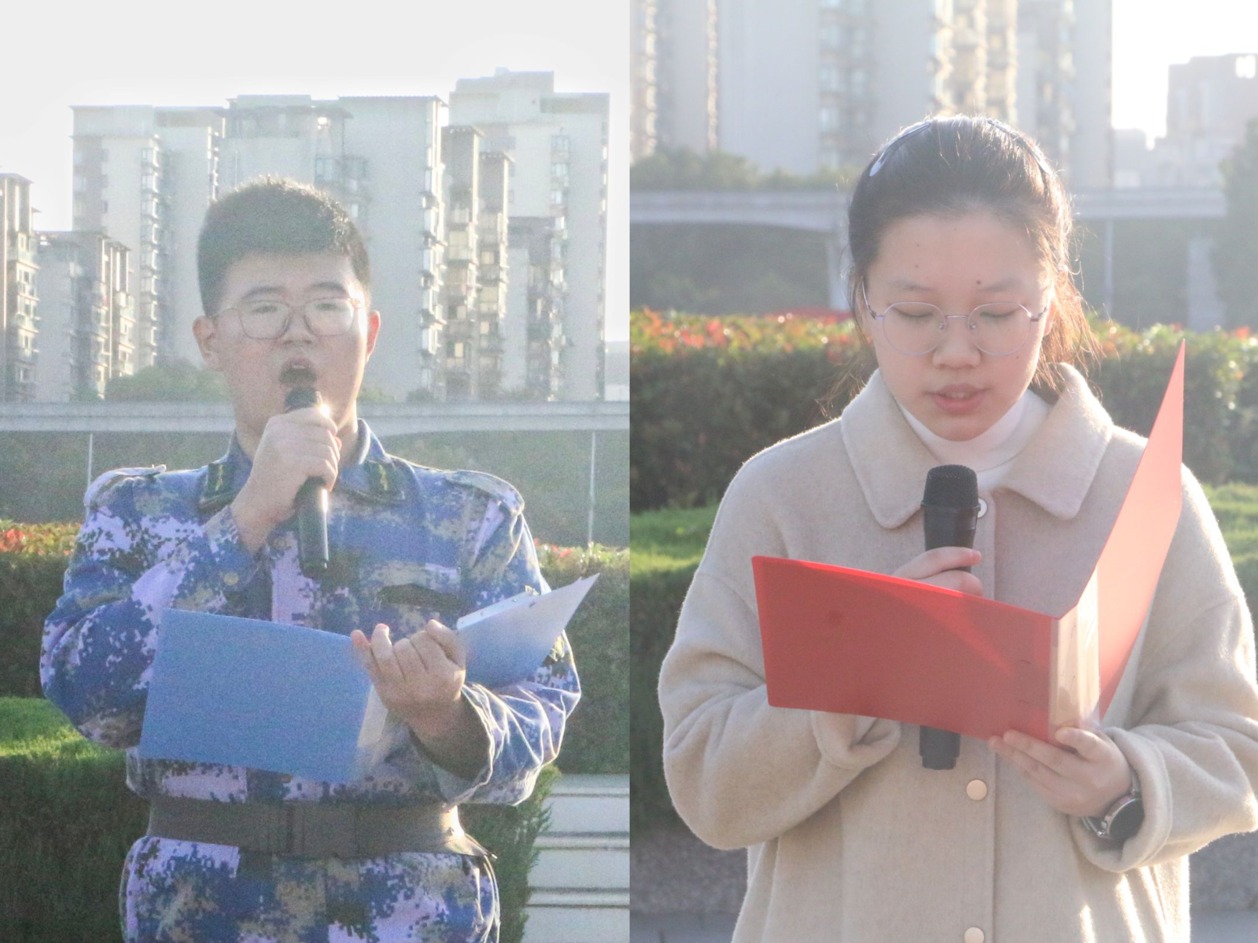 清晨七时,朝阳初升,升旗仪式正式开始。国旗护卫队步伐铿锵、庄重有序,护送五星红旗入场。伴随着激昂的《义勇军进行曲》,全体师生肃立注目国旗冉冉升起,齐唱国歌。这一刻,炽热的自豪感与崇高的敬意在每个人心中激荡,晨光中的升旗仪式更显庄严而动人。新生代表、2025级生物技术专业高成远以“爱国,用科技点燃生命之光”为主题,表达了以专业行动报效祖国的坚定决心。老生代表、2022级生物科学(师范)钱文欣以“怀蓝图,踏足迹,逐星光”为主题,分享了成长经验,鼓励新生学弟学妹珍惜大学时光,在专业学习与实践中锤炼本领、追求卓越。