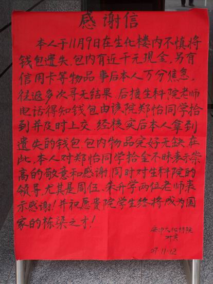 日前,我院收到了一份特别的“礼物”——一封来自化学与材料学院叶寅老师的感谢信。信上,叶老师对捡到钱包却拾金不昧、不计报酬的我院2006级学生郑怡同学表示衷心的感谢和高度的赞扬。