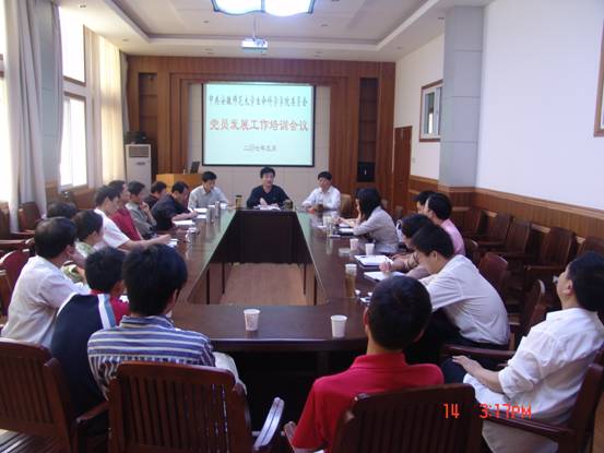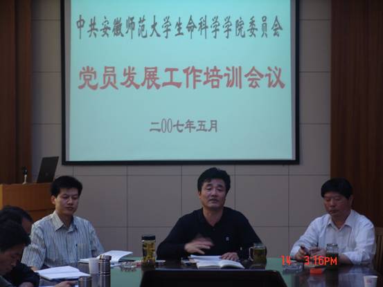 王景旭书记首先带领大家认真学习了相关文件,随后作了题为《明确任务,规范程序,加强指导,切实做好学院党员发展工作》的培训报告。王书记详细阐述了党员发展工作的重要性、程序和需要注意的问题,要求各党支部以学院党委成立为契机,规范入党积极分子培养教育、党员发展教育等各项工作,努力使学院党建工作不断再上新台阶。最后,周伍副书记就全校开展的2007年基层党支部主题实践活动创建工作作了布置。(邵登辉)