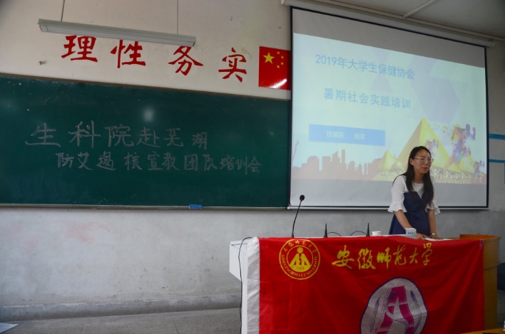 本网讯(防艾遏核宣教团队 李琳珠、林甜甜) 7月5日,生科院赴芜湖防艾遏核宣教团队在田楼8201召开了2019年大学生保健协会暑期社会实践培训会。校医院副院长、指导老师段萍,院团委副书记胡玮,大学生保健协会会长及前防艾队长凡定刚、前遏核队长汪寒砚、现防艾队长伊然与王和磊、现遏核队长何程程以及部分成员参与活动。培训会由防艾队安全负责人金宏与队长伊然主持。