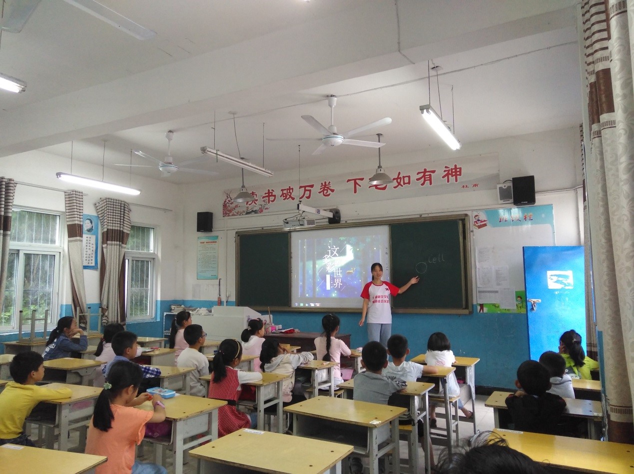 在课堂上,支教志愿者为学生们介绍了一些生活里常见到的动植物的学名以及它们的特性,让学生们对它们有更专业、深入的了解;播放变形虫捕食草履虫的视频,以激发学生们对于微生物世界的兴趣。学生们也在志愿者的讲述中表现出浓厚的兴趣。