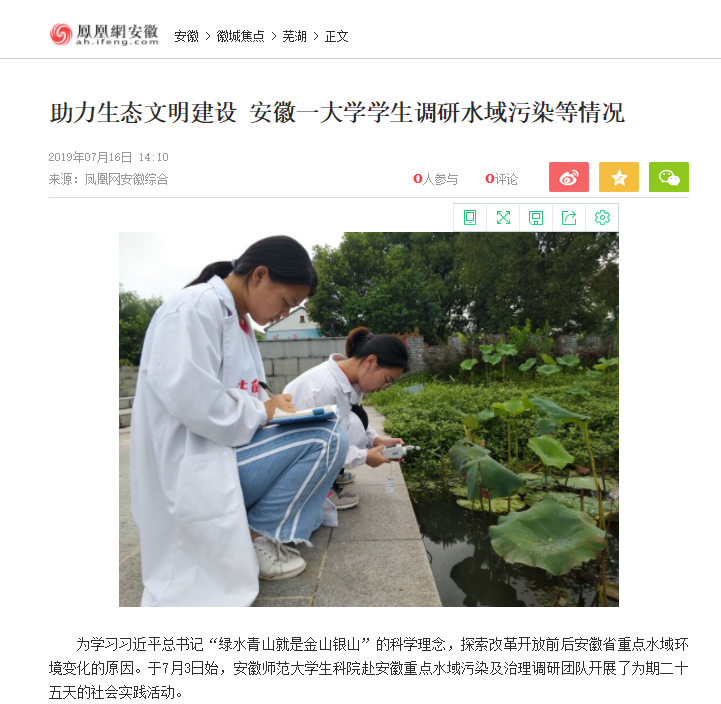 为学习习近平总书记“绿水青山就是金山银山”的科学理念,探索改革开放前后安徽省重点水域环境变化的原因。于7月3日始,bwin必赢线路检测生科院赴安徽重点水域污染及治理调研团队开展了为期二十五天的社会实践活动。