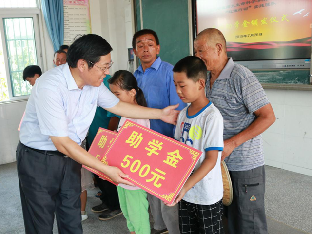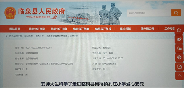 砥砺奋斗,勇担时代责任。今年暑期,来自生物科学(师范)、小学教育、体育教育等6个不同专业的12名志愿者们经过前期信息搜集和实地考察,确定了农村小学的教育短板,开设趣味数学,英语,音乐,手语,体育,自然科普等课程以及防艾禁毒主题活动、户外动植物认知、“朗读者”经典诵读比赛,叶脉书签制作活动,主题教育系列讲座,趣味运动会,文艺汇演等特色活动。针对国家级贫困县的留守儿童,团队通过前期线上线下爱心募捐,向孔庄小学的6名困难学生发放助学金3000元。在实践中,团队得到了临泉县教育局、团委、妇联,杨桥镇中心校老师等的大力支持,纷纷参与其中,支教活动还得到了临泉县政府宣传报道。