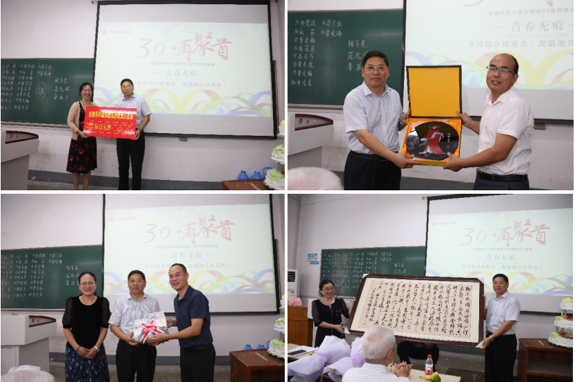 4日上午,学院党委书记蒋学波陪同校友们参观了生化楼,接着来参加聚会的32位85级校友与当年的辅导员、部分任课教师、学院部分领导在曾经上课的赭山校区教学楼304教室(现为1305)齐聚一堂,畅谈30年的流金岁月。值得一提的是学院党委书记蒋学波、教授刘爱民也是生物系85级毕业生中的一员!