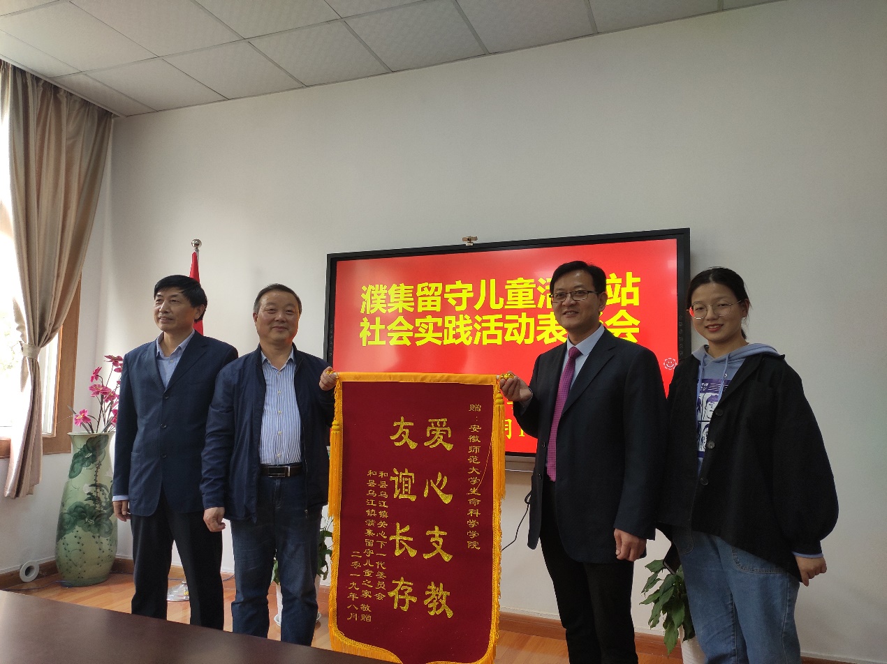 本网讯(生科院 吴子怡) 10月18日下午,马鞍山市和县乌江镇关工委主任张广源向76net必赢线路检测中心送来写有“爱心支教 友谊长存”的锦旗,感谢生科院师生暑期支教义举。乌江镇濮集初中校长祁伏华、副校长李继汉,濮集留守儿童之家负责人王加胜陪同来访。双方就暑期支教活动还开展了座谈表彰。