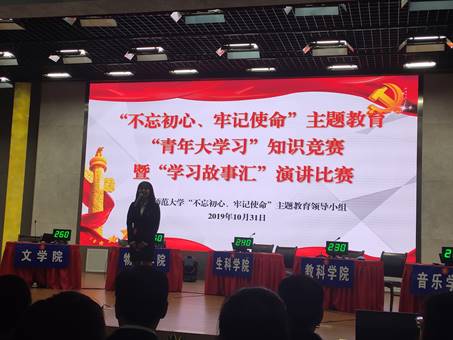 本网讯(生科院 王艺)10月31日,校“不忘初心、牢记使命”主题教育“青年大学习”知识竞赛暨“学习故事汇”演讲比赛决赛在花津校区理科大楼一楼报告厅举行,校党委常委、副校长毕明福出席。我院2016级园艺专业、学生党员钱若男、田梦瑶,2018级生物科学专业学生张丹琪参赛。
