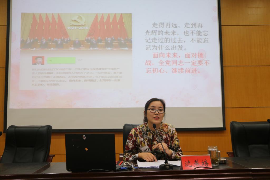 沈燕培老师枚举大量史实和先进模范事迹阐释了中国共产党人的初心和使命,她指出,初心是一种对科学与真理的不懈追求,是一种与时俱进的艰苦奋斗,是一种赢得民心的欢欣鼓舞。全党上下开展“不忘初心、牢记使命”主题教育,是用习近平新时代中国特色社会主义思想武装全党的迫切需要,是推进新时代党的建设的迫切需要,是保持党同人民群众血肉联系的迫切需要,是实现党的十九大确定的目标任务的迫切需要。我们每位党员要通过在统揽“四个伟大”中、在建设现代化五大发展美好安徽中践行初心使命,争做新时代合格共产党员。