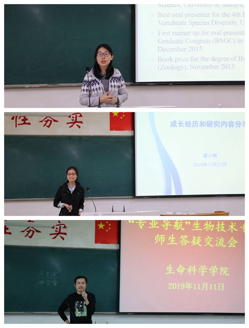 会议伊始,来自马来西亚籍专业教师李冰欣向我们详细介绍了她的研究方向“生态与动物多样性”,通过ppt给同学们展示了她在做科学研究的过程中发生的趣事,让同学们开拓了视野,也让同学们了解到了做科研不一样的方面,让我们对动物多样性的研究有了更深的认识。之后,美国密歇根大学博士后谭小娟通过讲诉自己从高考失利名落孙山的低落,到凭着坚持不懈的精神,迎难而上,经过勤奋刻苦的努力,最终成功获得跨专业博士学位的故事向在场的师生诠释了自己的求学经历。德国乌尔姆大学博士张亚以一个毕业师兄的身份,用诙谐幽默的语句向同学们述说了自己当年在安师大生科院读书时候的经历。他鼓励同学们明确专业目标,找准研究方向,通过做科学研究激发自身的学习兴趣。三位教师精彩的报告,博得了同学们的一致好评,现场不时传来同学们阵阵热烈地掌声。