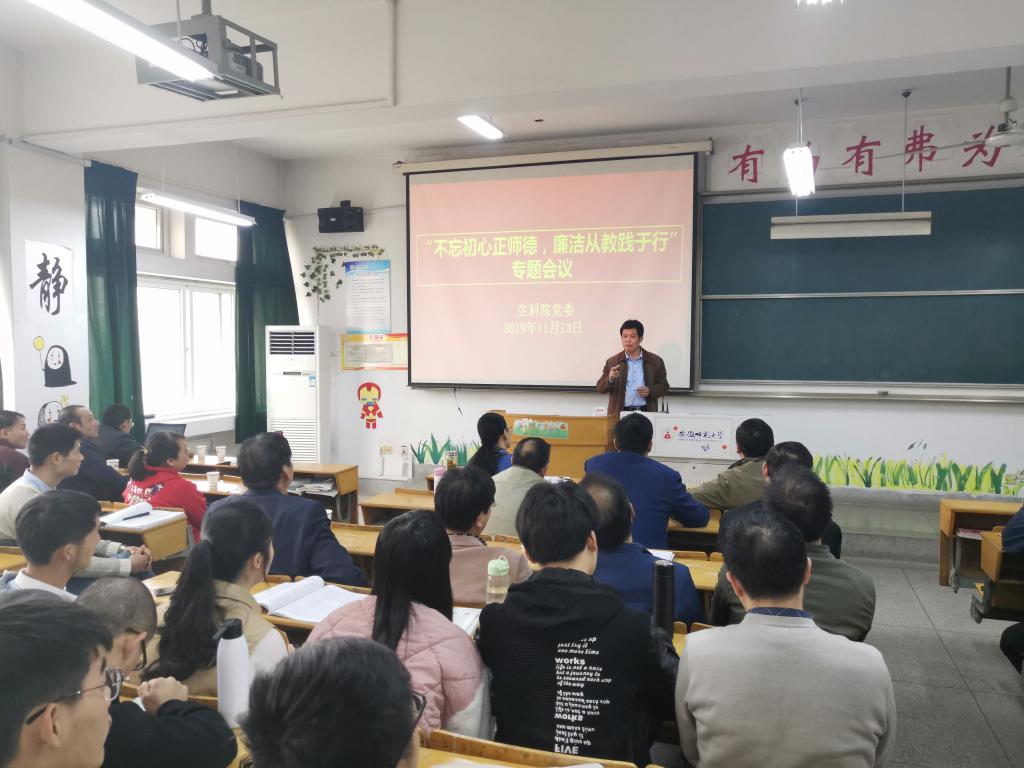 本网讯(生科院 潘川)2019年11月13日下午,生科院党委召开“不忘初心正师德、廉洁从教践于行”专题会议,全院导师和部分研究生参加会议。会议由学院院长吴孝兵主持。