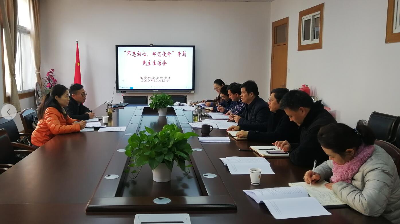 本网讯(生科院 汪倩倩)12月12日下午,生科院党委召开“不忘初心、牢记使命”主题教育专题民主生活会,学院全体党员领导干部参加会议,民主党派班子成员、副院长朱国萍以及非处级党委委员刘爱民、汪倩倩等列席会议。会议由学院党委书记蒋学波主持。学校主题教育第二指导小组副组长、数统学院党委副书记喻娜出席并作指导讲话。