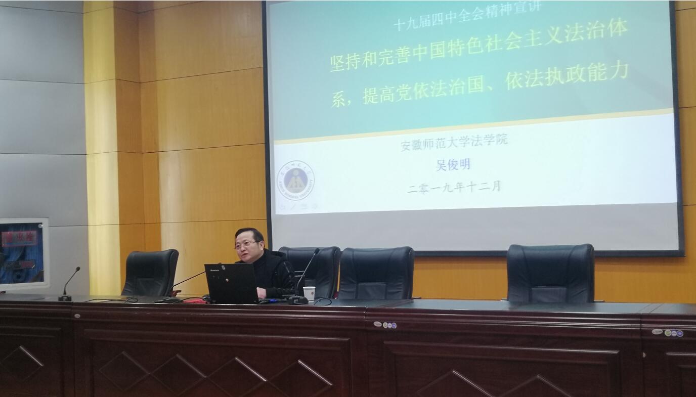 本网讯(生科院 何馗馗/文 汪倩倩/图 )12月18日下午,生科院党委邀请校十九届四中全会精神宣讲团成员、法学院吴俊明教授作了题为《坚持和完善中国特色社会主义法治体系,提高党依法治国、依法执政能力》的报告。报告会由学院党委书记蒋学波主持。学院教职工和2018级本科生参加了报告会。