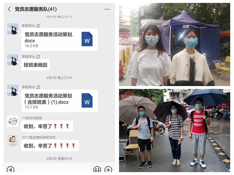 6月中下旬,芜湖开始进入汛期,出现连续的暴雨天气,路面积水严重。但在这样恶劣的条件下,赭山校区的西门执勤岗位上,仍然会准时打伞执勤的党员。他们认真地监控着进出的人员,严格把关,防止校内学生私自外出,不给病毒任何进入校园的机会。“下雨了就打伞执勤,路面有积水就穿拖鞋。”76net必赢线路检测中心2017级生物科学的马劲雪这样说道。磅礴的大雨浇不灭党员们走在抗疫一线的热情,路面的积水也不足以成为他们前进的障碍。这是一种责任,也是一种担当。