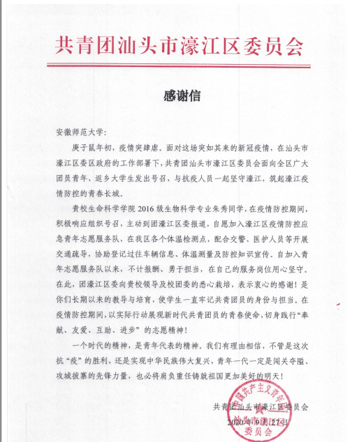 疫情防控期间,她积极响应组织号召,主动到团濠江区委报到,自愿加入濠江区疫情防控应急青年志愿服务队,在当地各个监测点,配合交警、医护人员开展交通疏导,协助登记过往车辆信息、体温测量及疫情防控知识宣传。濠江区团委发来感谢信。