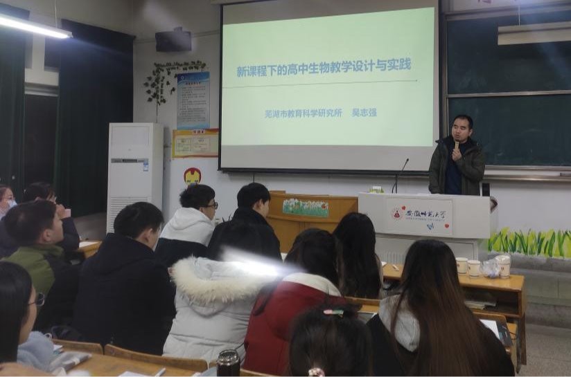 本网讯(生科院 何馗馗)为切实提高师范生培养质量,12月6日,学院邀请2008届校友、芜湖市教育科学研究所吴志强教研员为2018级生物科学专业同学作“新课标下的高中生物教学设计与实践”专题报告。生物科学专业负责人陈明林教授出席,辅导员何馗馗主持报告。