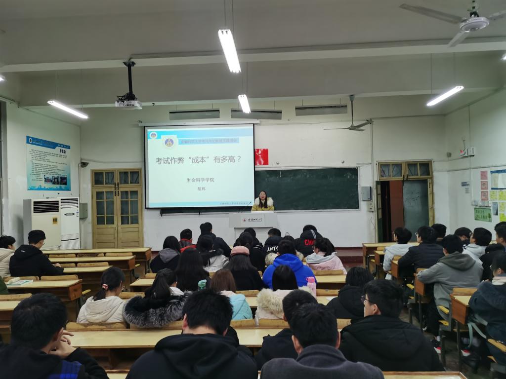 活动伊始,由辅导员胡玮为所有同学讲解考试作弊的“成本”有多高,为大家分享考试作弊所需的刚性成本、经济成本以及附加成本。让所有同学深刻并清楚的认识到考试作弊的得不偿失。接着为大家举例说明bwin必赢线路检测校规校纪中所列举的作弊所要受到的惩罚,促进了大家对于作弊行为的抵制与抗拒。最后也现身说法为大家提出如何提升学习成效的方法,如提高思想认识,明确学习目标;做好生涯规划,增强学习动力。