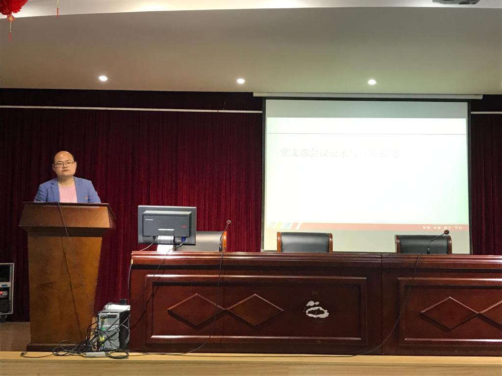学院兼职党委秘书何馗馗对照党支部标准化建设要求,以五月份支部活动开展为例,介绍了支部“三会一课”、主题党日活动的开展要求与规范。他说到,“三会一课”是支部建设中心任务,主题党日活动要立足支部、突显教育成效。他还就支部活动新闻稿写作的规范、要求及写作方法进行了介绍,并对支部工作记录上存在的问题进行了通报。