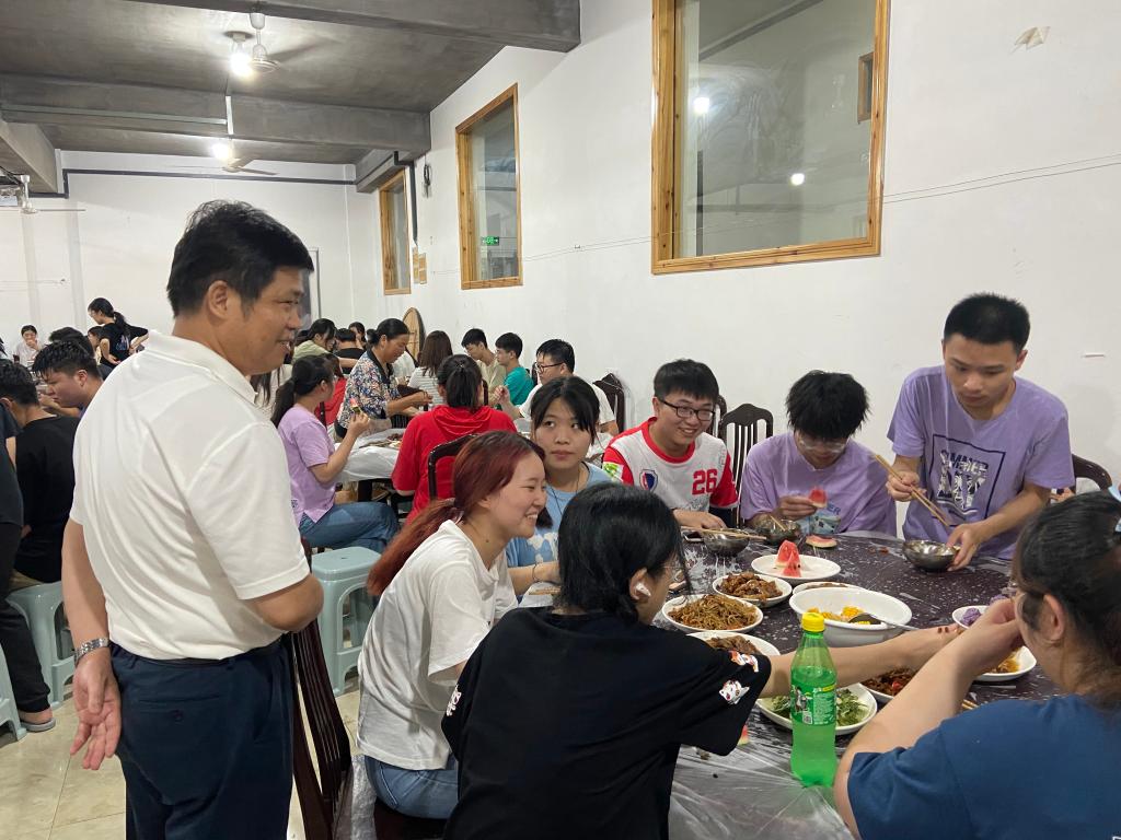 蒋学波向带队老师详细地了解了实习的进展,对同学们的学习任务完成情况给予了充分的肯定,并鼓励大家不怕困难,继续前进。随后,他又走访餐厅和宿舍,与同学们亲切交谈,询问心得体会。汪倩倩向师生再次强调了安全问题,她表示学生在实习期间需听从老师安排,做好防疫、人身和财物等安全防护工作,将安全放在第一位。