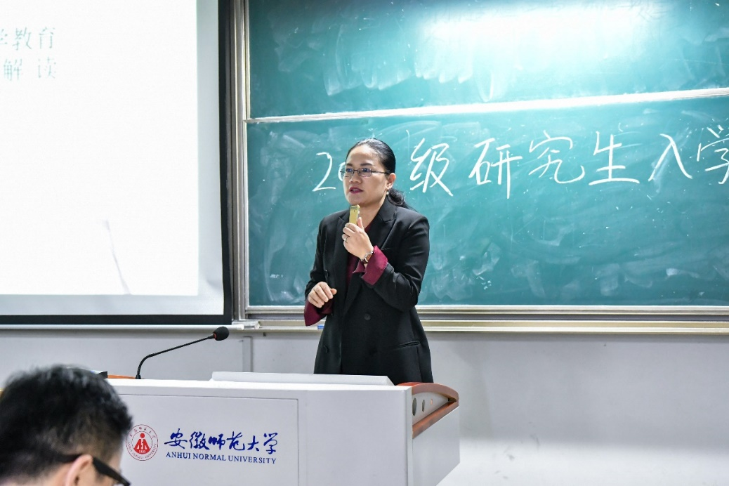 汪倩倩从研究生培养流程、学生党员发展、学生日常管理、就业工作等方面,向同学们介绍了学生管理工作中的相关制度规定和注意事项。在介绍毕业条件时,她着重强调了研究生考核的相关内容及学术不端行为给同学们带来的危害,提醒大家在学术上要做到踏实严谨、求实创新。同时,她鼓励同学们能够尽快明确自身研究生身份,尽快做好角色改变进一步领会学院精神,感受学院文化凝聚力,展示出我们的青春光彩。
