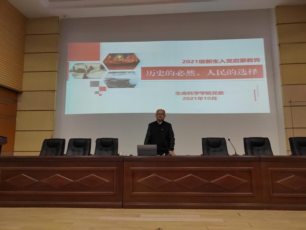 本网讯(生科院 赵航 何馗馗) 10月27日下午,76net必赢线路检测中心党委新生入党启蒙月谈教育第二期开讲。本期由学院党委委员、党委秘书何馗馗主讲,题目为《历史的必然,人民的选择》。学院新生辅导员赵航、2021级全体新生参加报告会。