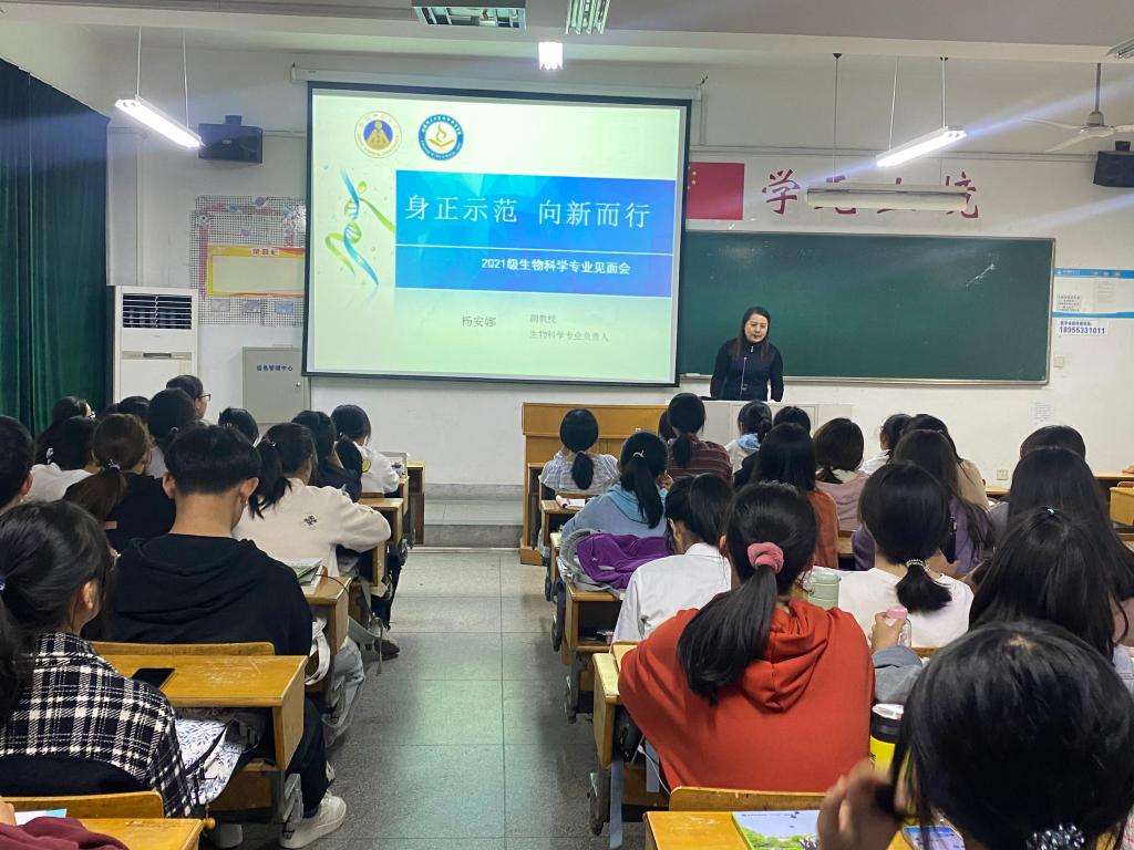 告别中学,放飞青春。会议从专业技能、人才培养、未来方向三个主题进行讲解,细分为生科人之骄傲、勇于改变自我、科学素养培养、逐步站稳讲台、青春何为、专业培养要求六部分分析。杨安娜老师告诉学生,生物系自1930年建系辉煌无数,生物科学专业(师范)培养出大量中学高级和特级教师,2020年通过示范专业国家二级认证。同时,杨安娜老师介绍了多位从生科院走出的杰出校友,让同学们深入了解了生科院的历史底蕴和教学成就。随后她指出,生科院的辉煌还将由代代学生创造,故要求学生不仅要掌握过硬的理论知识、实验技能,还要在大学期间勇于突破自我、发掘自身潜力。最后杨安娜老师勉励学生:青春,不只有诗和远方,更有激情奋斗、顽强拼搏的无悔岁月,希望同学们从“傲娇”的大学生长成“骄傲”的生科人。同学们听后深受鼓舞,反响热烈。