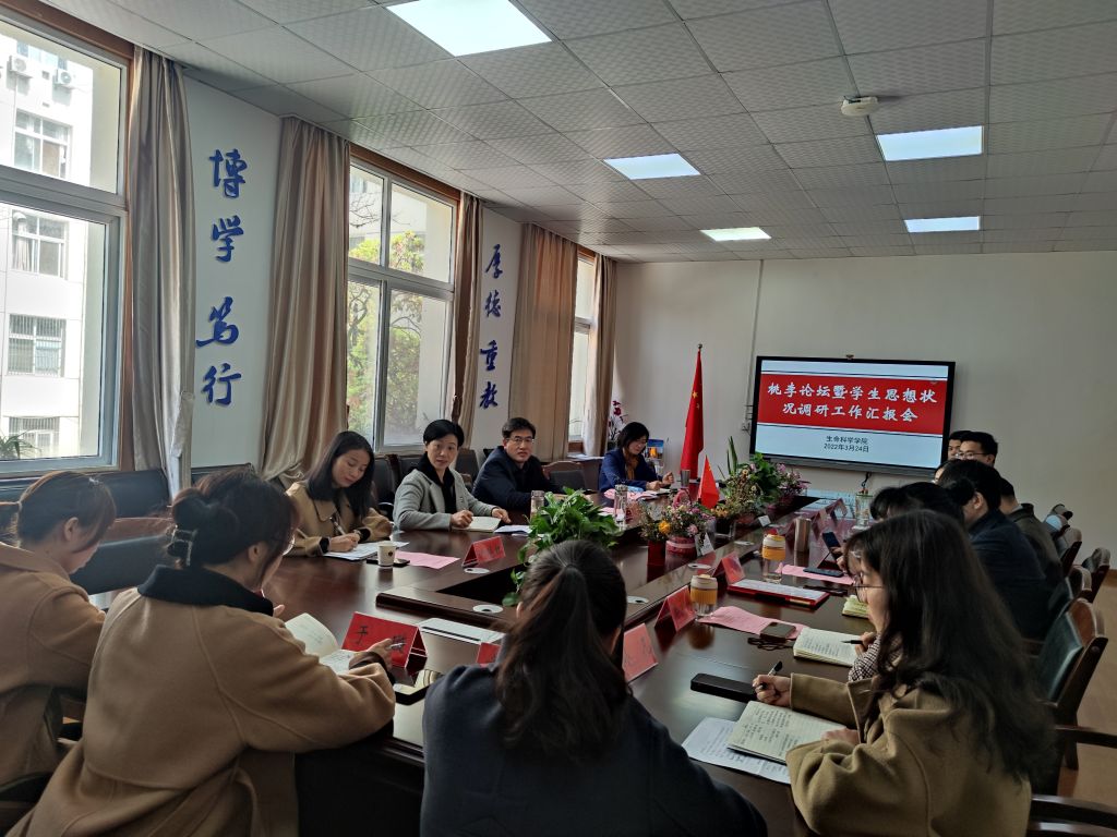 3月24日上午,76net必赢线路检测中心在生化楼A202会议室召开学生工作第一期桃李论坛暨2022年春季学期学生思想状况调研工作汇报会。校学生处处长邵登辉、副处长宋静、大学生心理健康教育中心主任沈艳红出席会议。会议由生科院党委副书记汪倩倩主持,学院全体专兼职辅导员参加会议。