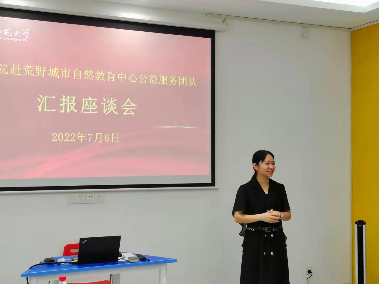 自然教育中心本科生社会实践团队代表王璇总结了团队在此次社会实践中取得的成果,并向老师们保证会继续努力,团结协作,携手自然教育,全力以赴向儿童以及青少年传播自然科学知识。
