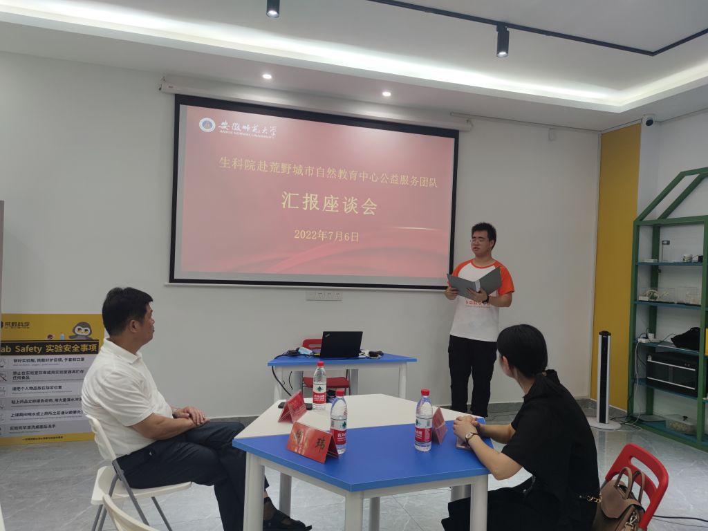 本网讯(生科院 王璇)7月6日,学院党委书记蒋学波在暑期社会实践思政指导教师匡宁和学院团委书记胡玮的陪同下,来到赭山公园自然教育中心慰问在此开展暑期社会实践的团队队员。生科院赴芜湖荒野城市自然教育中心实践团队向学院领导汇报了实践工作。汇报座谈会由团队队长汪立峻主持。